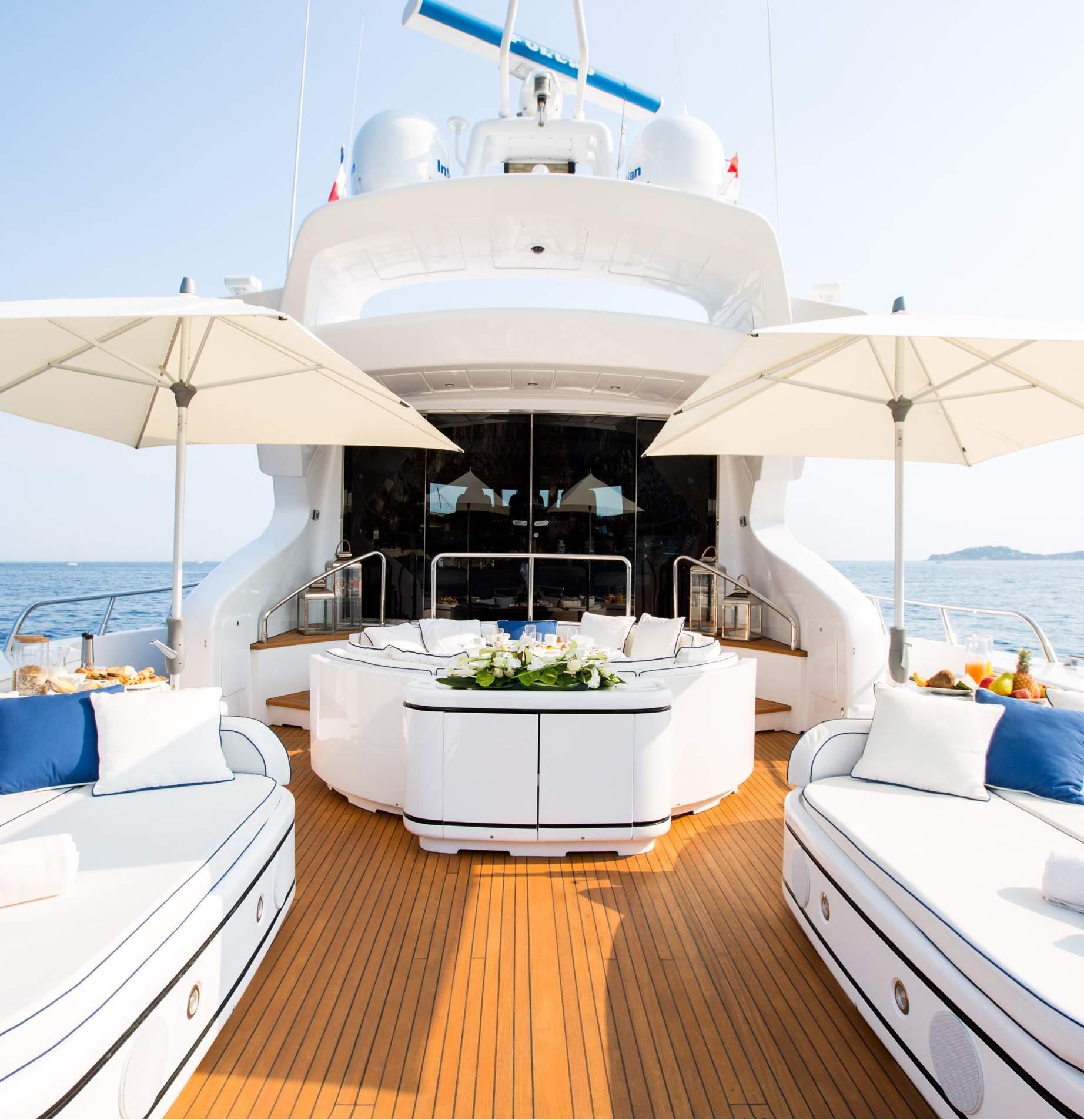An upper salon is at deck level and has 2 semi-circular sofas and tables, a perfect addition to the adjacent aft deck. Her second salon is just a few steps down from the main deck and offers a large sofa, coffee table, opposing open plan formal dining table and full entertainment systems. On the lower deck are 4 guest cabins.