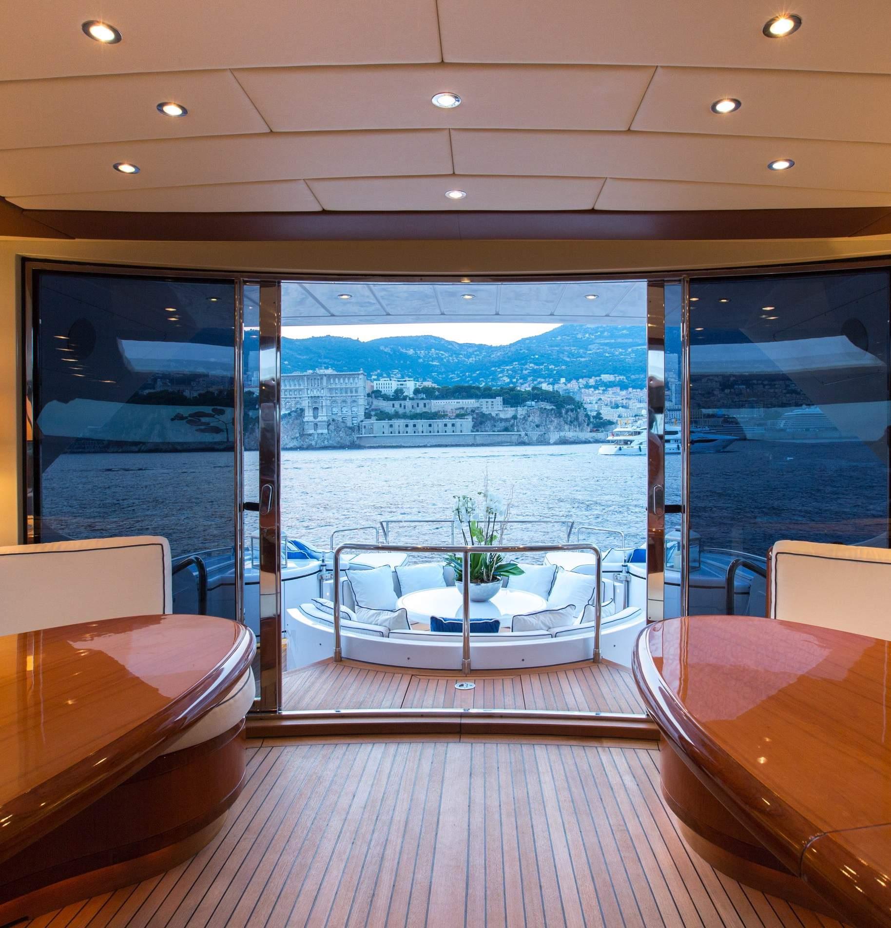 An upper salon is at deck level and has 2 semi-circular sofas and tables, a perfect addition to the adjacent aft deck. Her second salon is just a few steps down from the main deck and offers a large sofa, coffee table, opposing open plan formal dining table and full entertainment systems. On the lower deck are 4 guest cabins.