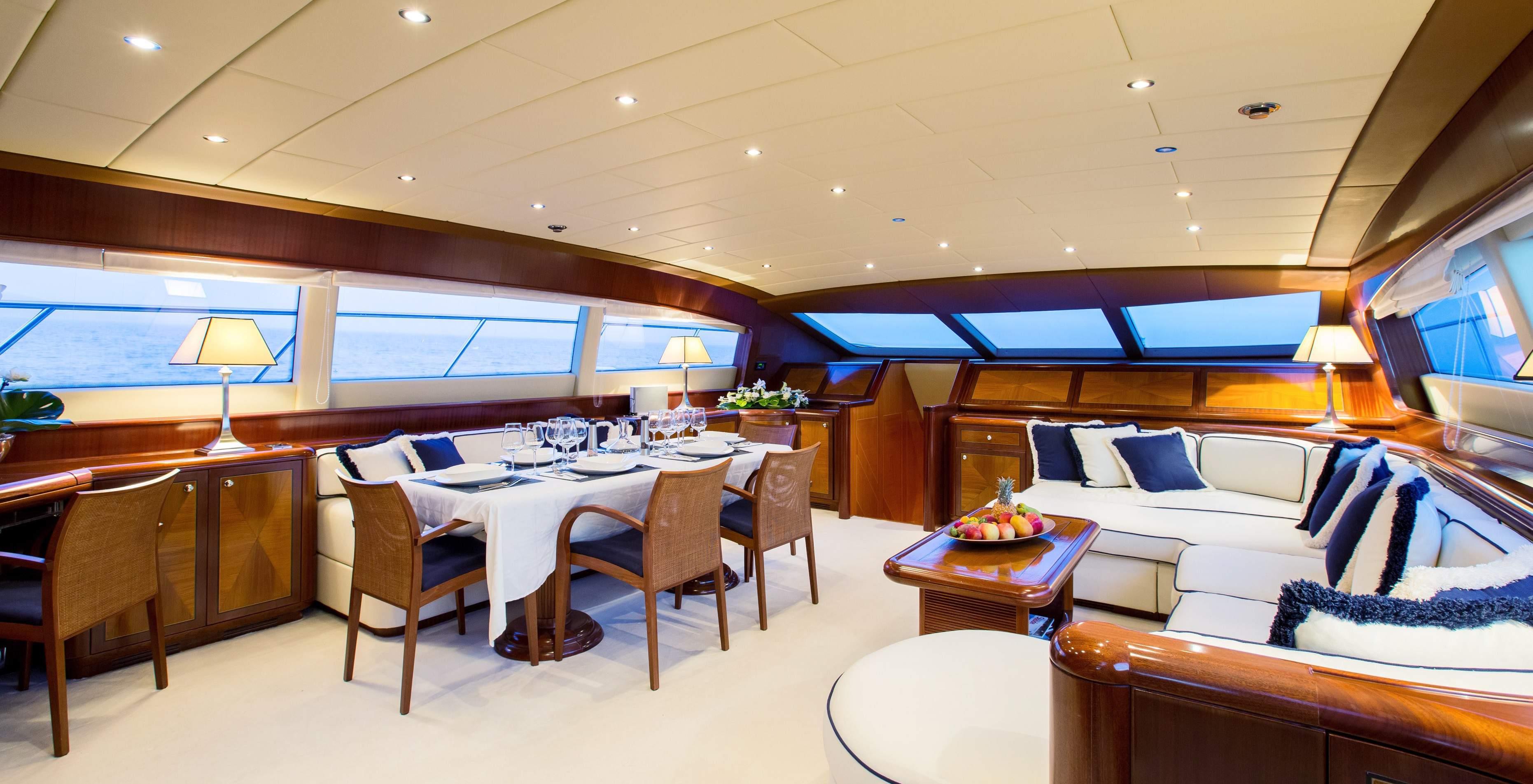 An upper salon is at deck level and has 2 semi-circular sofas and tables, a perfect addition to the adjacent aft deck. Her second salon is just a few steps down from the main deck and offers a large sofa, coffee table, opposing open plan formal dining table and full entertainment systems. On the lower deck are 4 guest cabins.
