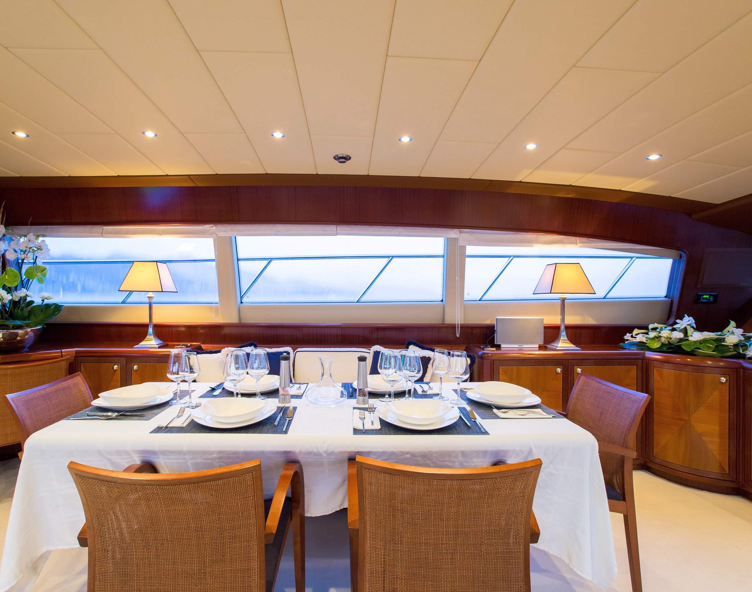Her second salon is just a few steps down from the main deck and offers a large sofa, coffee table, opposing open plan formal dining table and full entertainment systems. On the lower deck are 4 guest cabins.