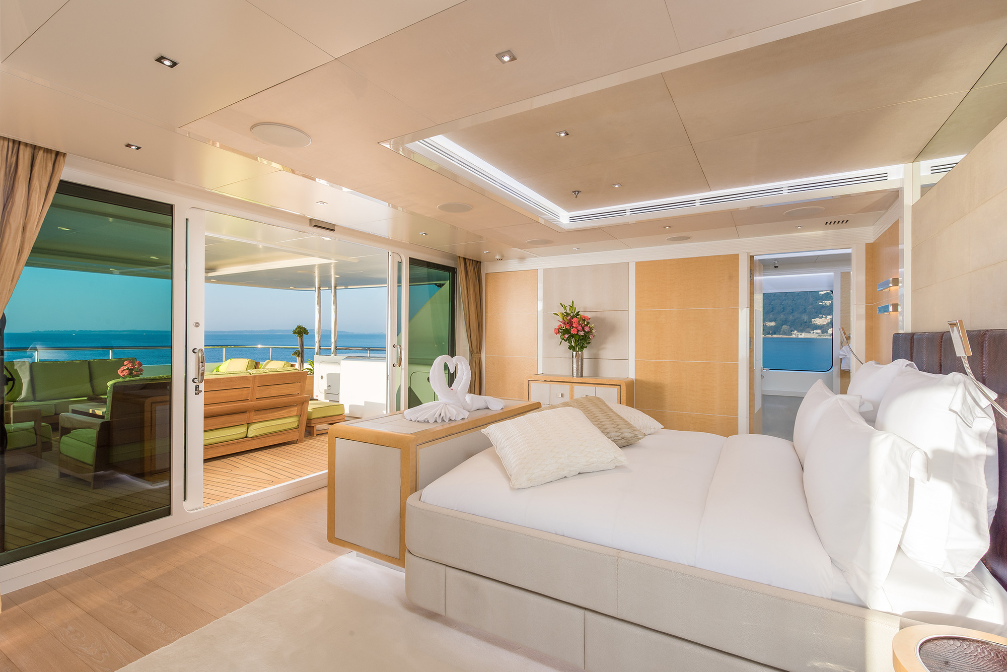 The lower deck of the superyacht JADE 959 offers 2 VIP cabins and 2 twin cabins.