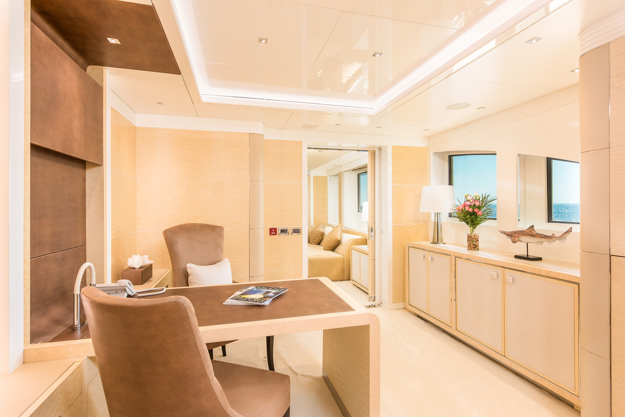 On the main deck forward of the salon, is the first full beam master cabin, with private study and center lined king size bed. On the upper deck, the second master cabin is full beam of the yacht, with a large private study / meeting lounge and center lined king size bed. The lower deck offers 2 VIP cabins and 2 twin cabins.
