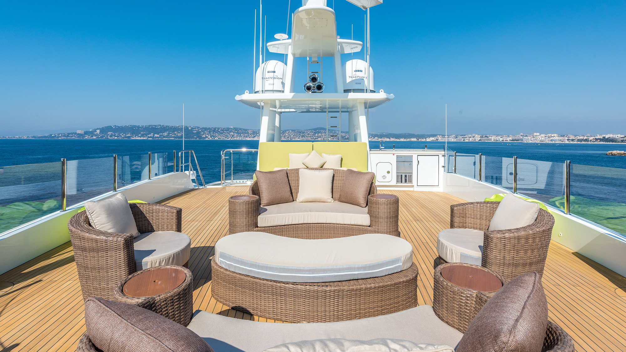 On the top deck are a social dining table and wet bar aft. Forward a custom designed entertainment room features surrounding panoramic windows and ample lounging, ideal for movies and gaming. The lower deck of the superyacht JADE ...