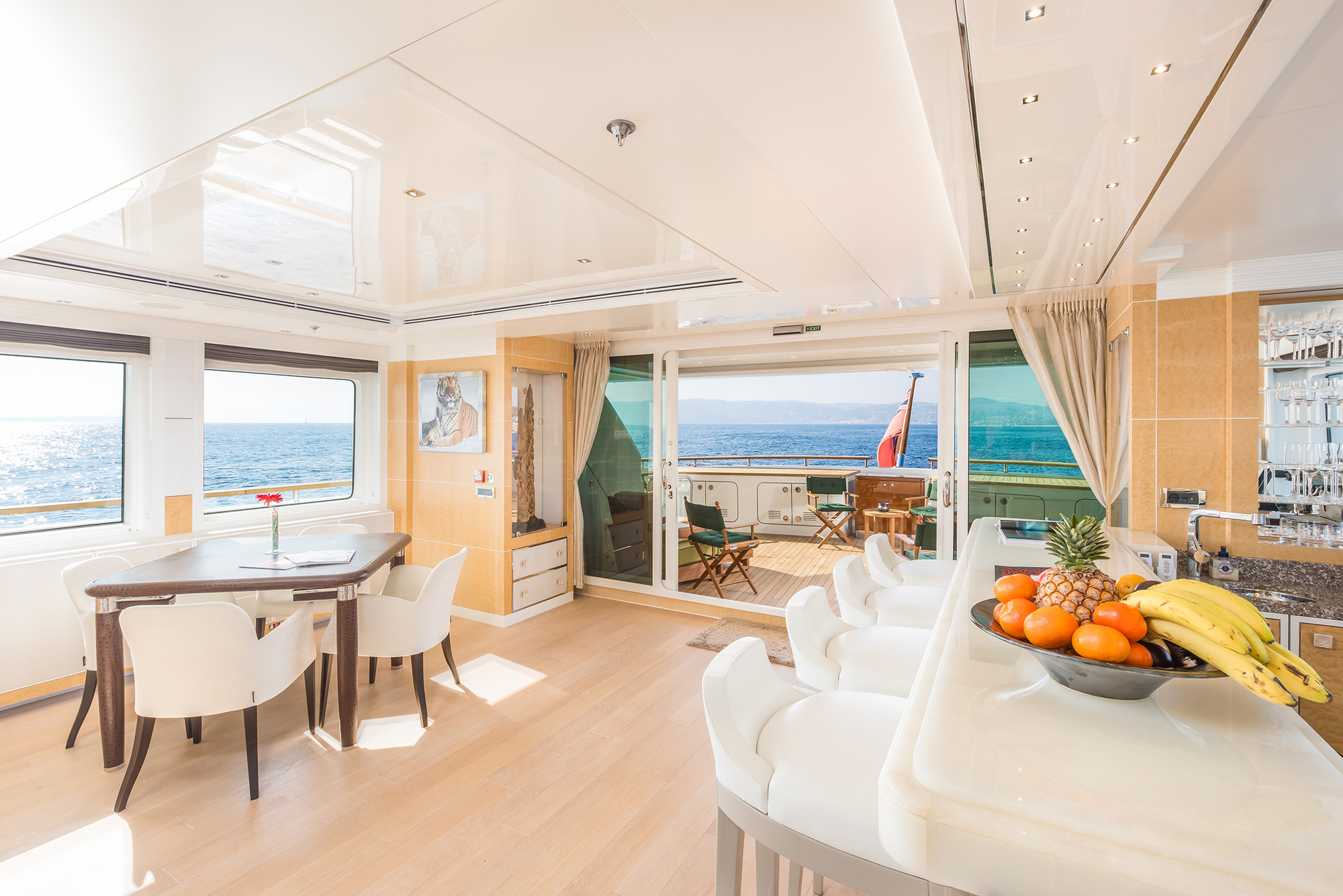 Forward of the salon is the formal dining table, easily seating all 12 guests, while aft of the salon is a complete wet bar, with stool seating and state of the art entertainment systems. Forward on the main deck is the first master cabin, with a full beam layout, center lined king size bed and spacious lounge/study.