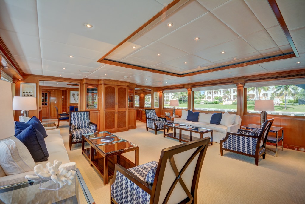 The main salon offers lounge seating on port and starboard, each with plush sofas, occasional chairs and coffee tables. Further forward is the formal dining table, which can be left as semi open plan, or enclosed by pocket doors. A marble floored foyer leads to the lower guest cabins and master cabin on the main deck.