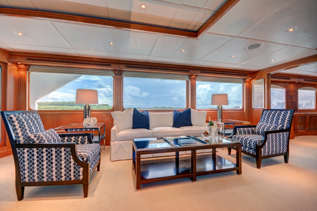 The main salon offers lounge seating on port and starboard, each with plush sofas, occasional chairs and coffee tables. Further forward is the formal dining table, which can be left as semi open plan, or enclosed by pocket doors. A marble floored foyer leads to the lower guest cabins and master cabin on the main deck.
