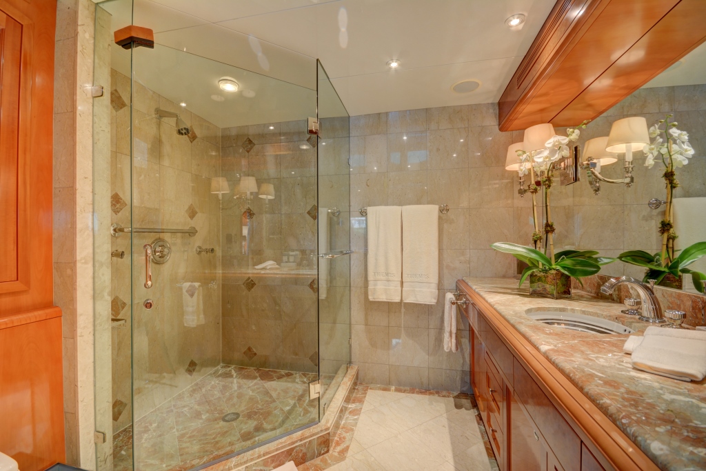 A marble floored foyer leads to the lower guest cabins and master cabin on the main deck.