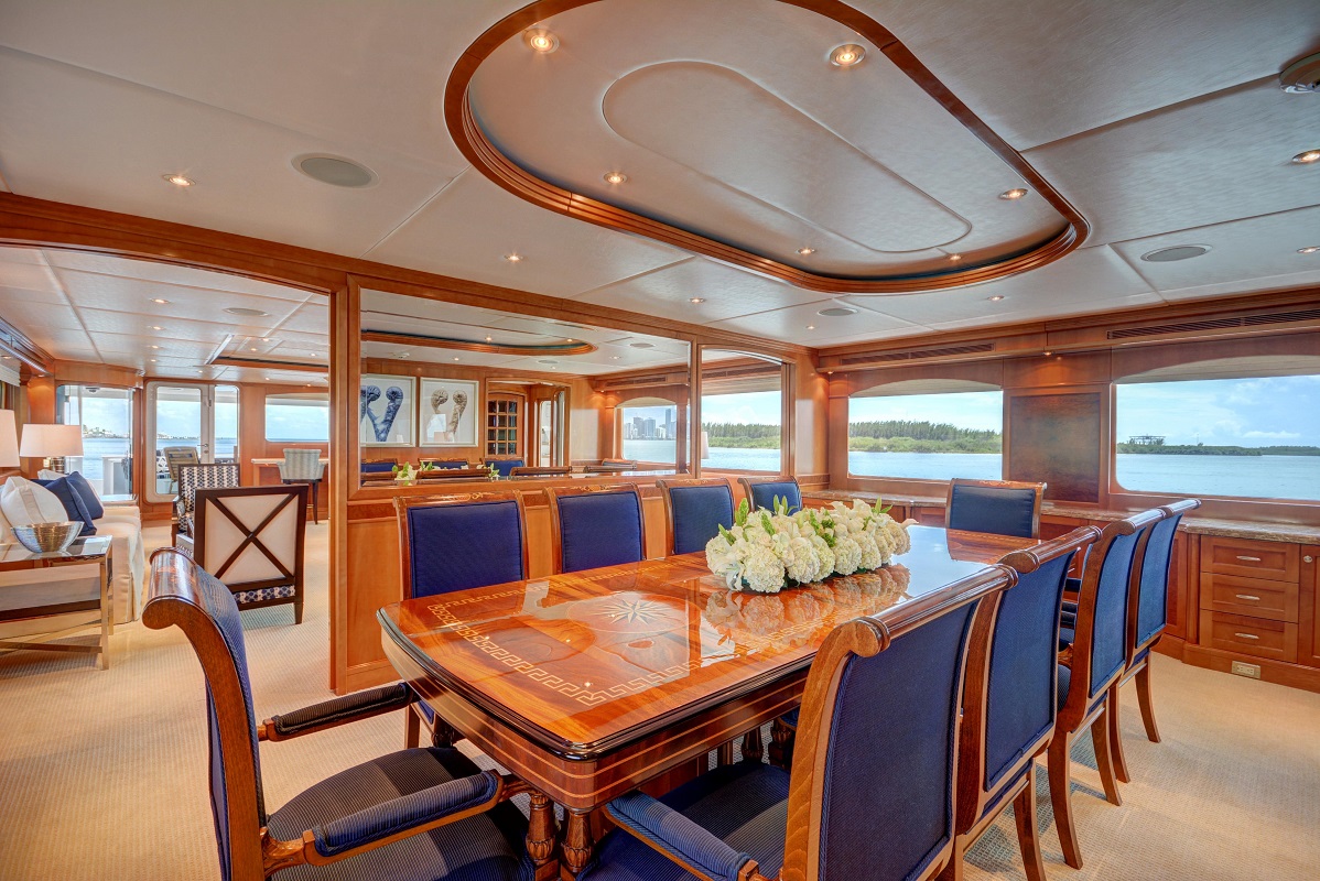 Further forward is the formal dining table, which can be left as semi open plan, or enclosed by pocket doors. A marble floored foyer leads to the lower guest cabins and master cabin on the main deck.