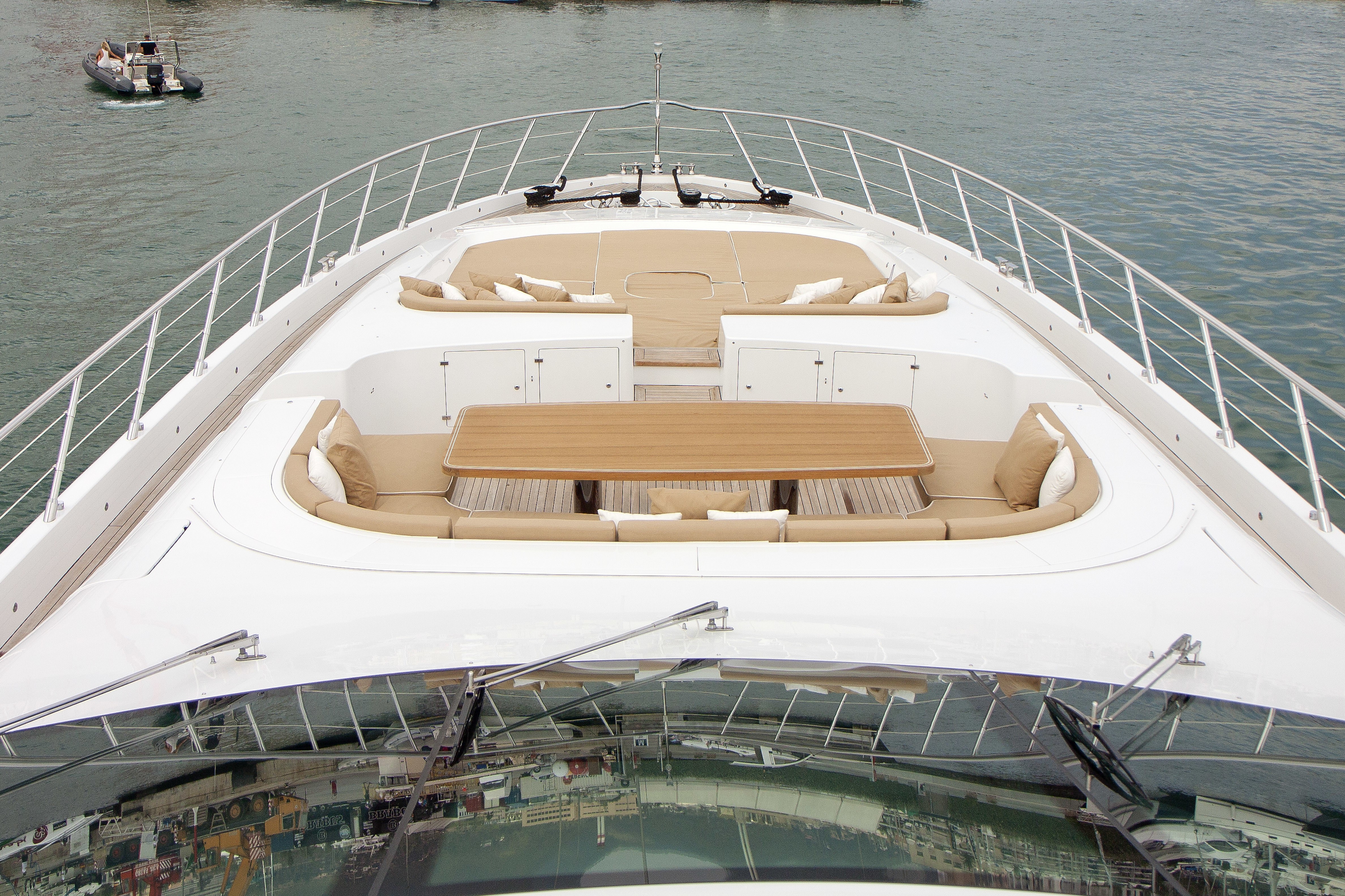 For water enthusiasts, the dual port and starboard steps provide effortless access to an extended swim platform and a good array of water toys. The main deck continues forward where a massive sunpad and large additional alfresco dining area, are perfect for any casual occasion or simply soaking up the sun.