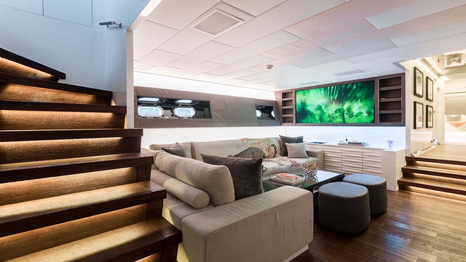 The main salon is an open plan, offering the generous lounge suite, coffee table and entertainment systems aft, with the formal dining table forward. Wrap-around windows, large sliding glass doors aft and a retractable overhead roof, bring in ample natural light.