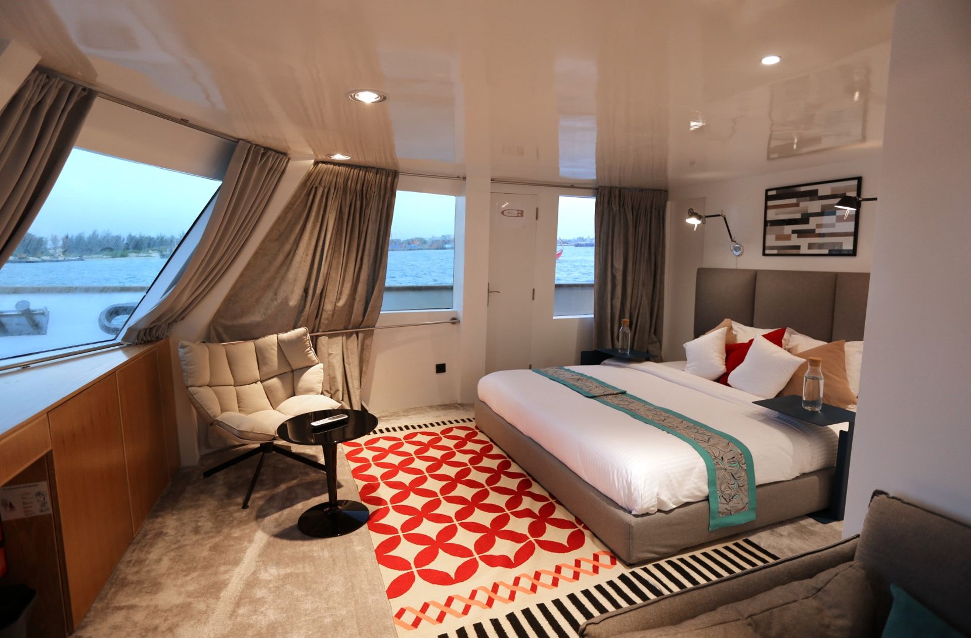 Twin Caterpillar engines producing 760 HP each allow for a cruising speed of 10 knots and a maximum speed of 14 knots.