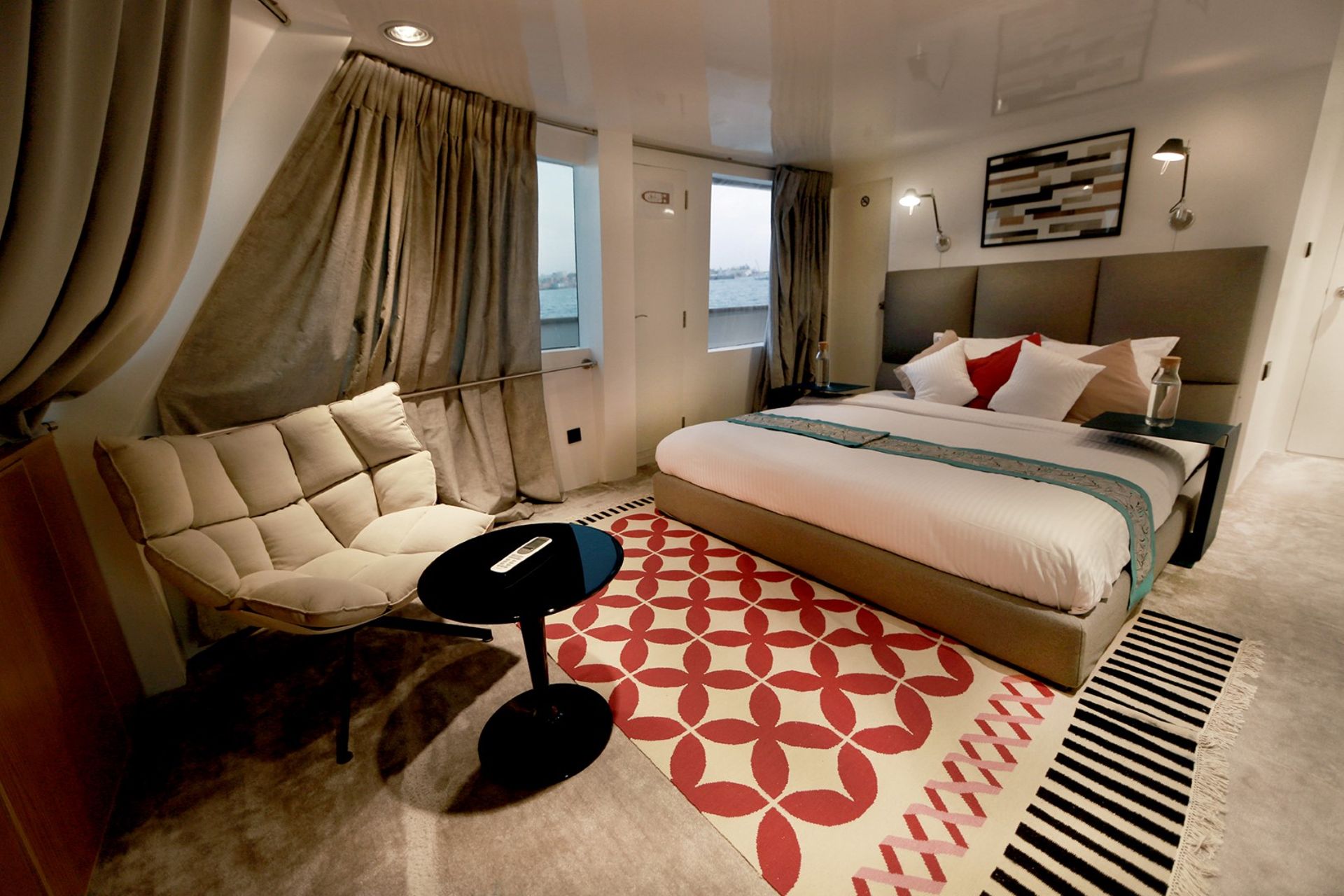 A 65" curve 3D TV provides entertainment during the evenings and while cruising between destinations.