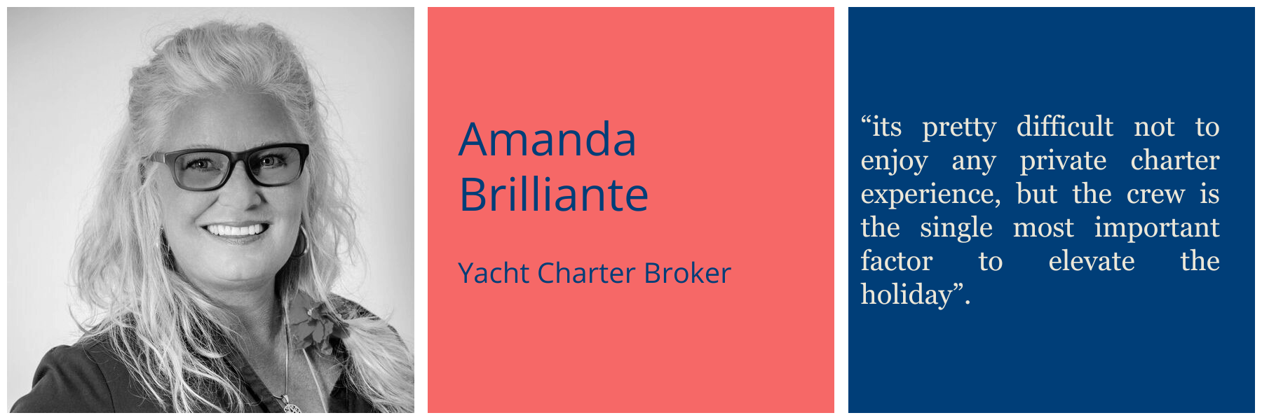 While she grew up “down the shore” and always loved the sea, Amanda's love of yachting came in the early 1990’s after joining family friends for 6 weeks of sailing adventure in South America during their circumnavigation of the globe. On her return to Los Angeles, she began racing, cruising and crewing on yachts from the Channel Islands to Mexico and the Caribbean before leaving a successful career in the entertainment industry to permanently “mess about on boats.” She accepted a position as Broker Assistant to a successful Beverly Hills-based broker to find that many of her entertainment industry contacts were also charter clients!