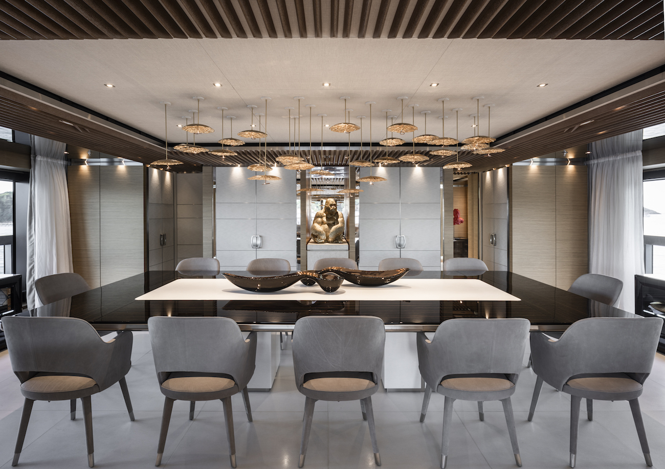 The formal dining area on the main deck aft has one of the most innovative amenities to be installed aboard a luxury yacht in recent times - an indoor barbeque. This open fire and the smoke it would produce required the use of A60 fireproof stainless steel and the installation of an advanced smoke removal system, and guests can watch their meal being prepared in front of them as flavoursome scents fill the room. An extensive wet bar creates a place to socialise and begin the meal with an aperitif before the group settles into the plush seats at the elongated formal dining table. Glass sliding doors on both sides of the room as well as the aft open the area up for fresh air and the sounds of the local maritime environment for a more connected experience.