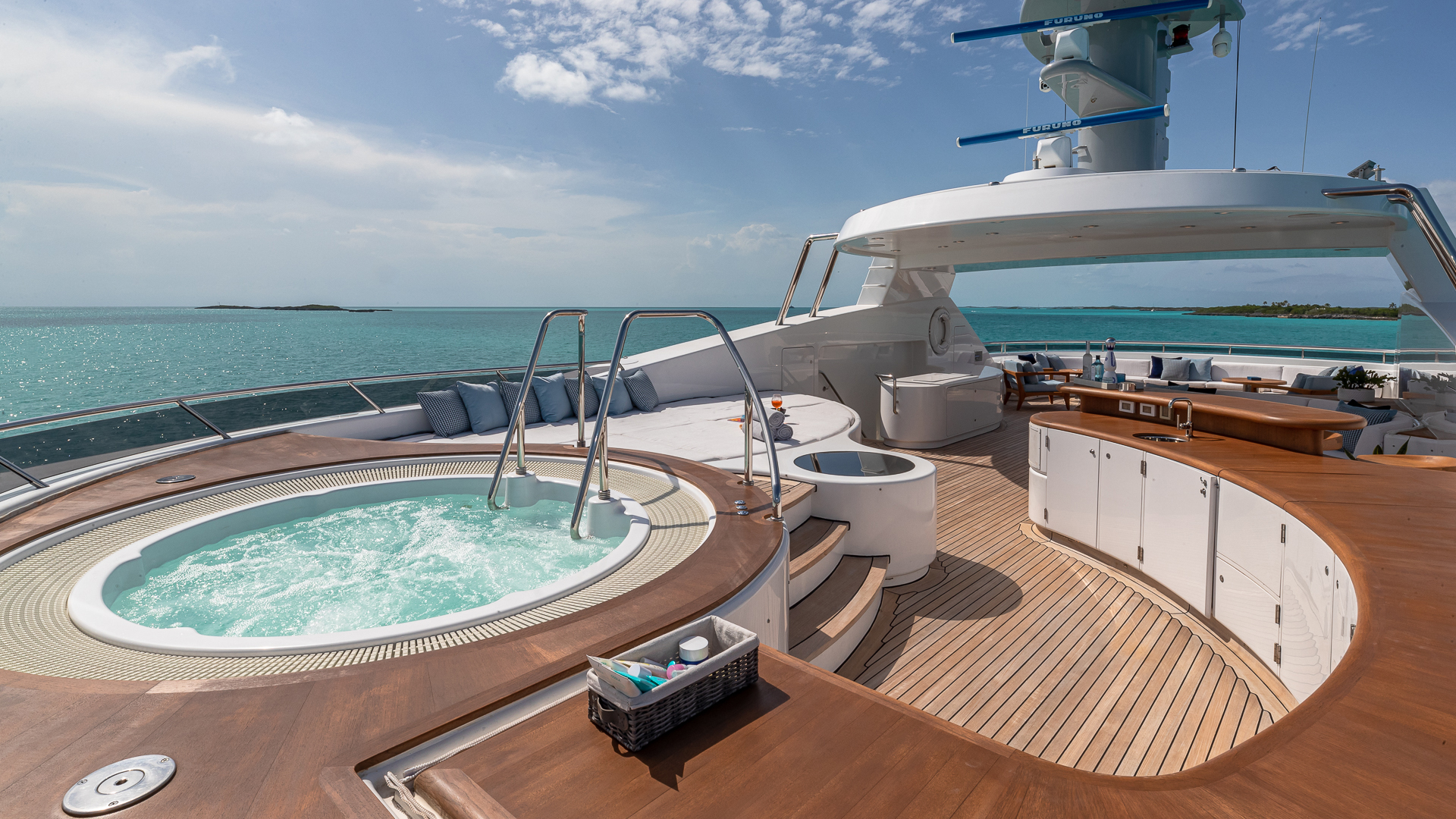When you are not dining or savouring a drink, there is plenty to keep guests occupied: plush sun pads, scattered with cushions create perfect spots for sunbathing, convivial seating arrangements bring people together and the collection of water toys will bring hours of fun. For those worried about swimming in the open sea, the yacht is equipped with a floating pool and dock plus a bubbling jacuzzi on the sun deck. The chase boats can take you ashore to explore local places of interest, indulge in some retail therapy or simply escort you to the nearest beach or secluded inlet.