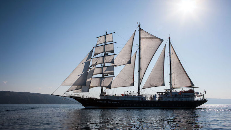 The elegant 64m/209ft sailing yacht RUNNING ON WAVES was built in 2011 by Segel Masten Yachten and combines the forms of a classic clipper with modern design and engineering elements. The accommodation sleeps up to 45 guests over 18 en-suite cabins, and while cruising there is a cinema, discotheque, conference multimedia room, an on deck spa pool, spa massage room and a dedicated centre for Scuba diving and water toys.