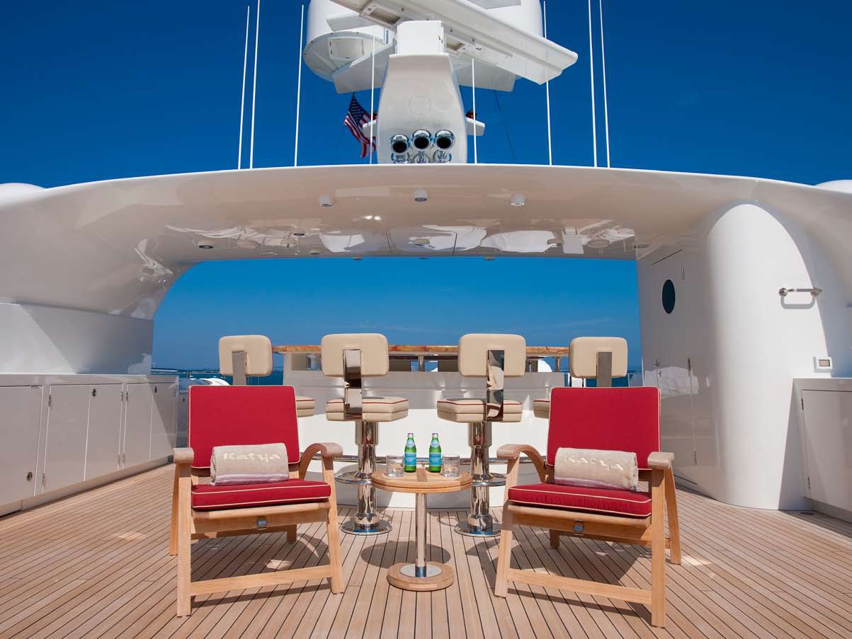 Avalon has so much more including an additional circular bar with similar stools to those in the sky lounge. A carbon-fibre radar arch provides shade when the weather is very hot. There’s also moveable gym equipment as well as a day head here. On the Portuguese bow, discover a small, private seating area along with a hydraulic articulated trailer system for getting the main tender in and out of the garage. This trailer system is one of the latest examples in yacht charter technology and certainly an eye opener when Avalon was first launched.