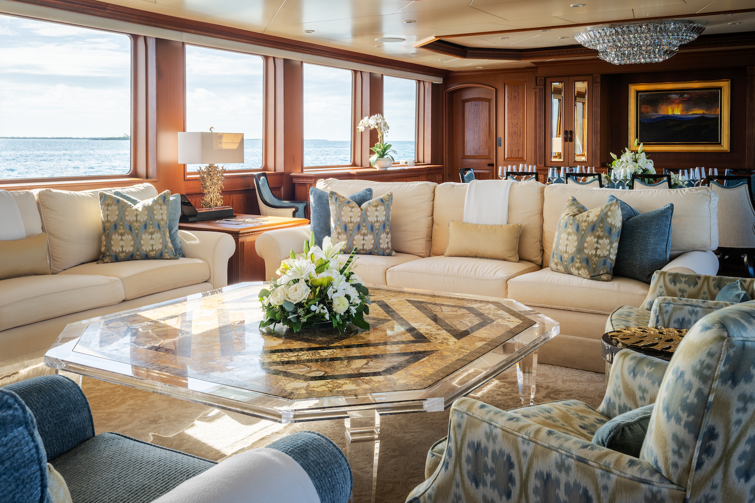 Time spent in the heavenly interior will give guests the chance to take in the custom-built African Cherry and Amboyna Burl wood furnishings and sink down into the elegant sofas adorned with neutral fabrics and accents of soft blue. Even with these premium finishes, CROSSED SABRE feels like a home from home with thoughtfully arranged sociable areas and luxury private staterooms.