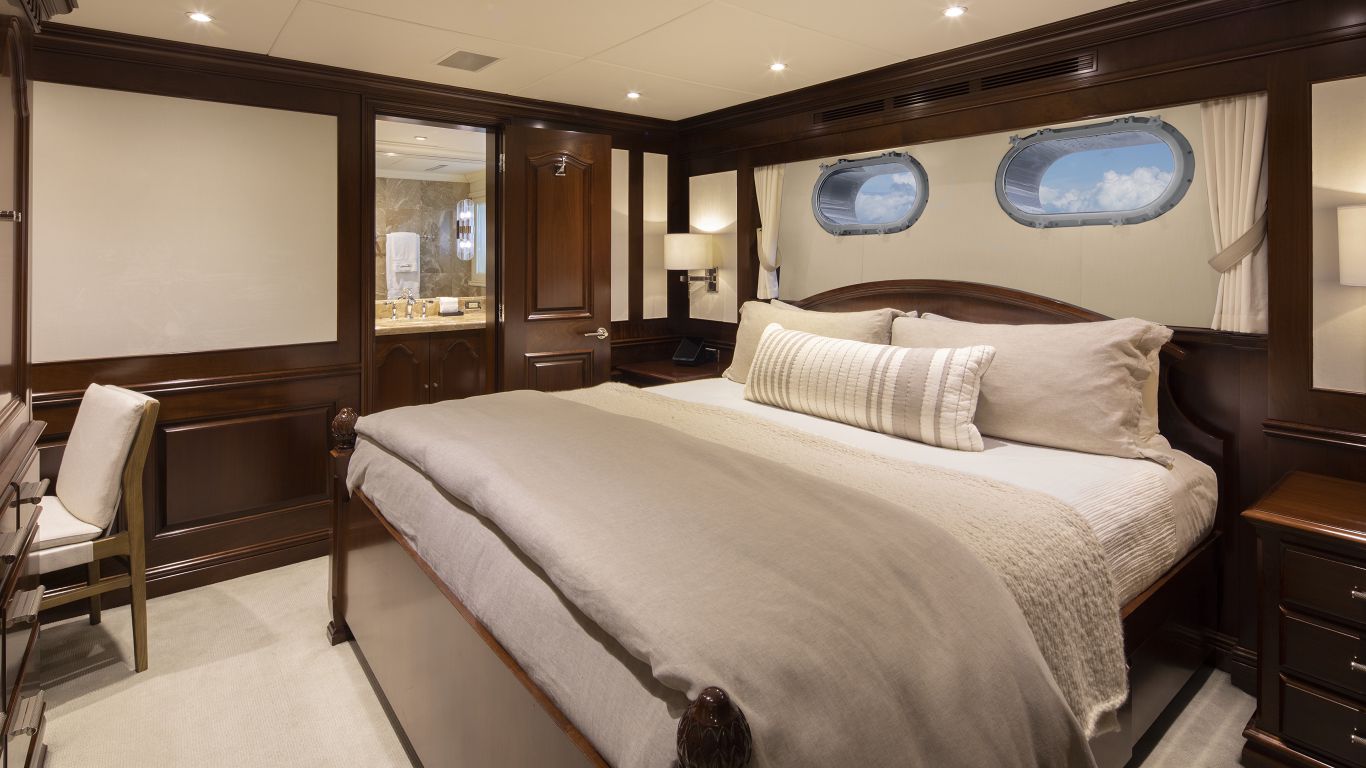 The full-beam Master Stateroom has a king bed and boasts beautiful African Cherry woodwork throughout. The cabin has a built-in sofa, vanity and luxurious ensuite with a large Jacuzzi tub, shower and his and her sinks. There are two king-bedded Guest Staterooms, situated amidships on the Lower Deck aft.