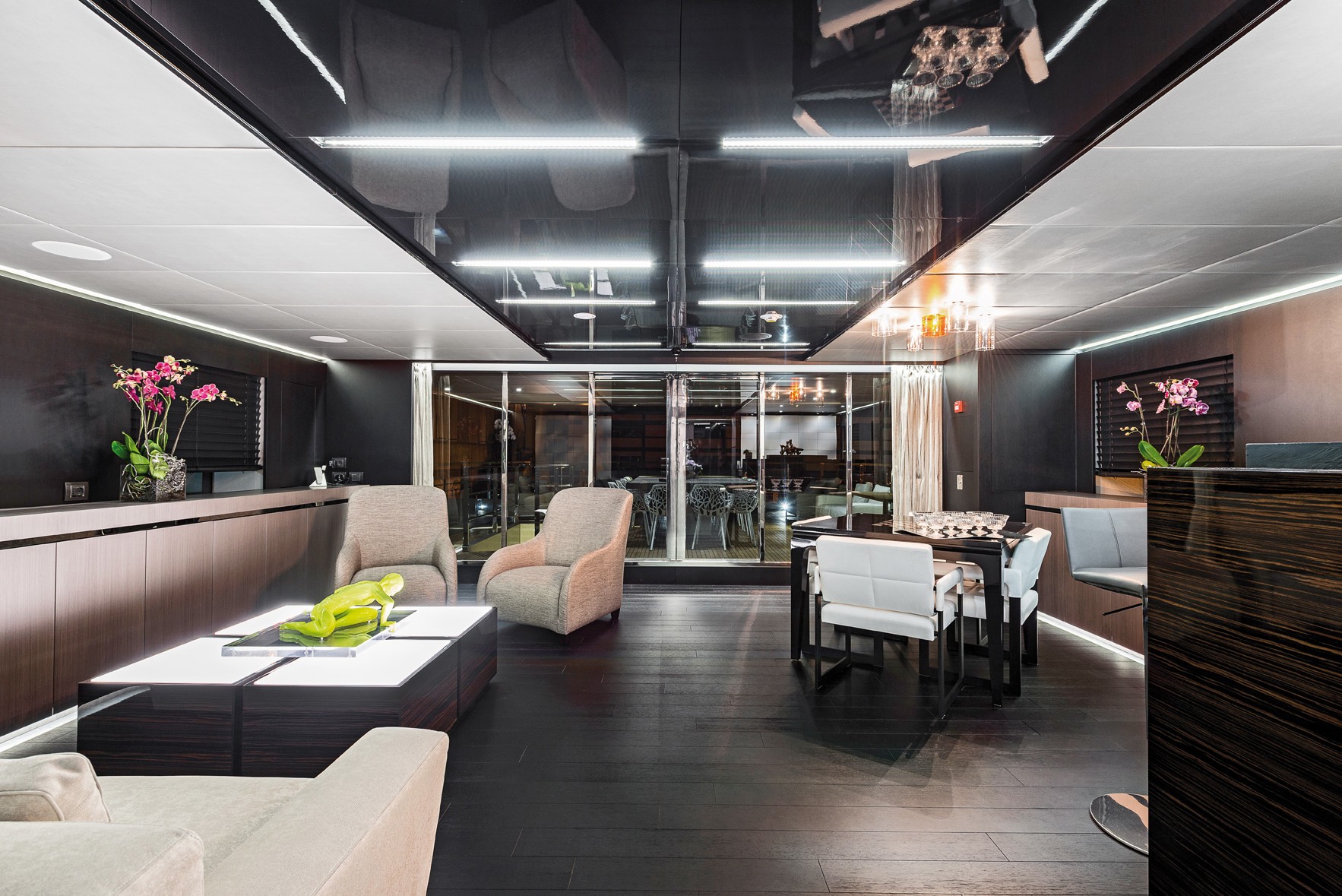 The main saloon of this stunning motor yacht has dark wood flooring with recessed purple lighting offsetting the fixtures. The metallic silver panelling contrasts very well in the minimalistic layout which makes a fantastic space for guests to relax.