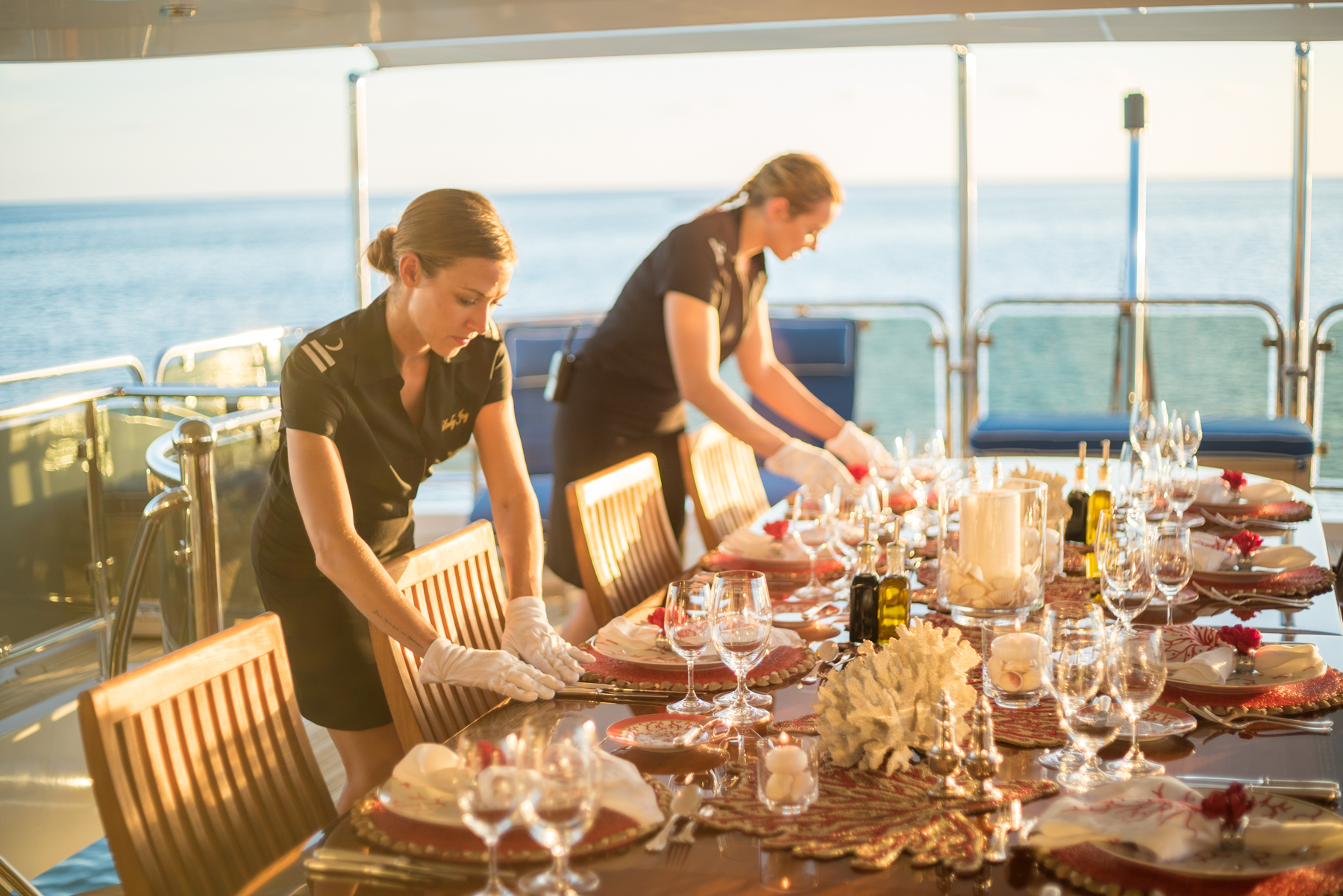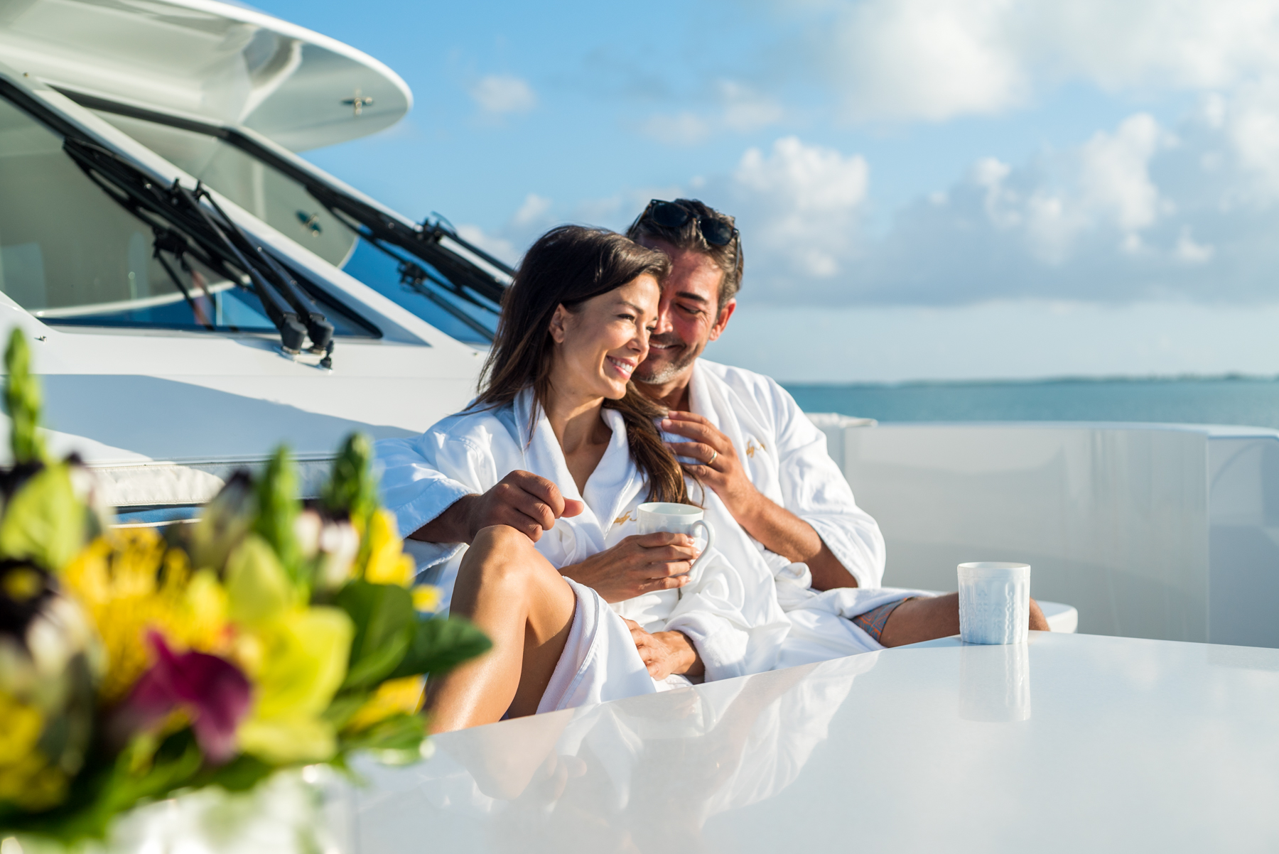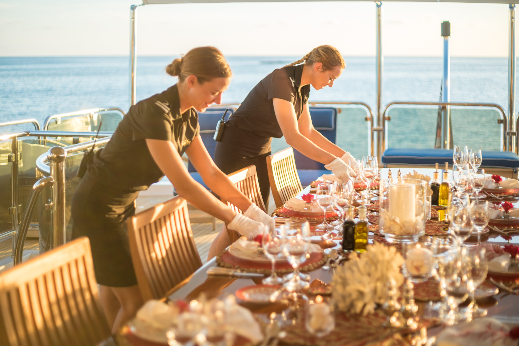 When guests return from the beach and want to rest outside, the main deck aft has a plush sofa and table for alfresco dining with the whole group, and the wet bar and air conditioned interiors are just a few steps away.