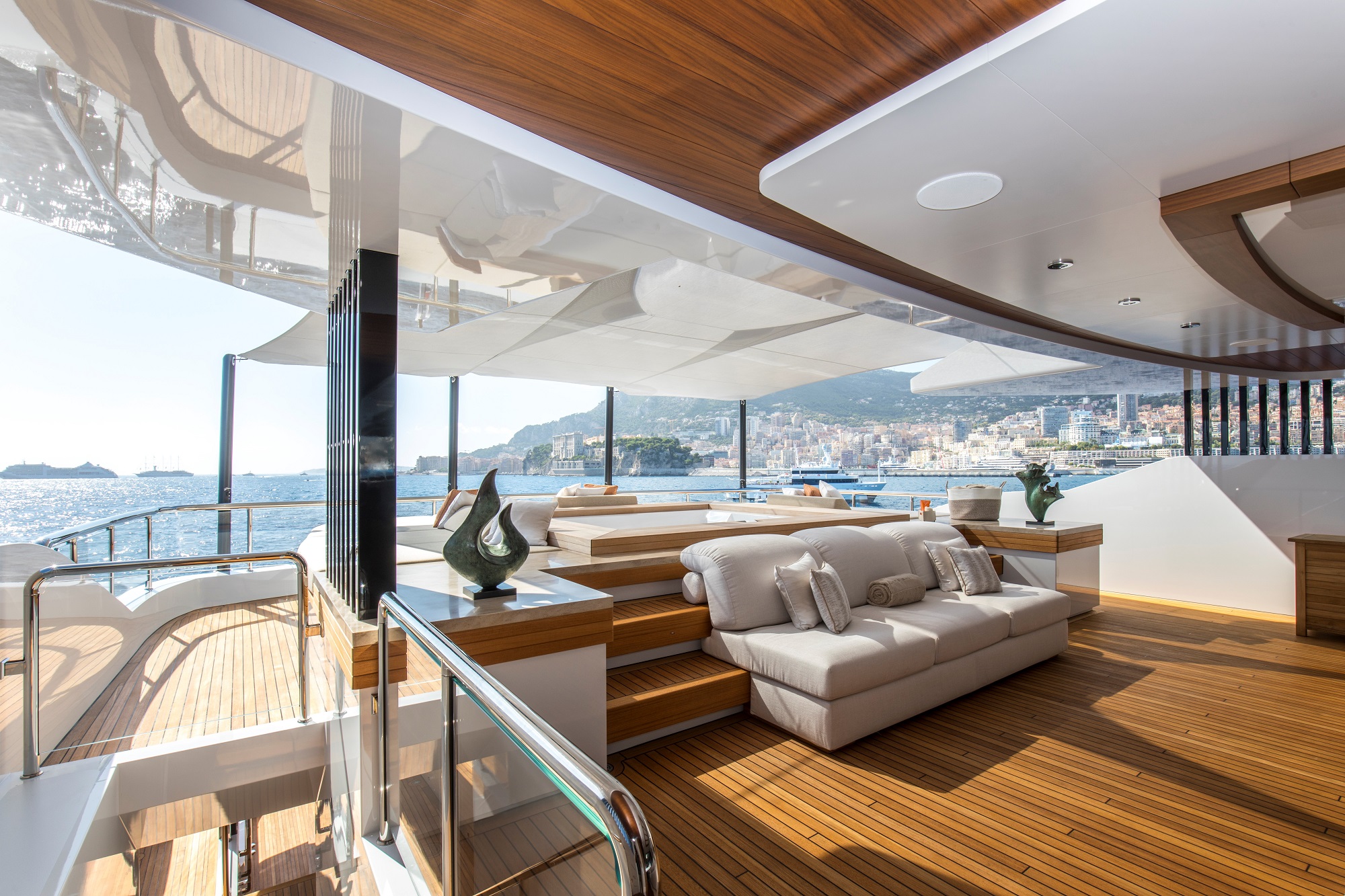 The main deck aft also boasts a sizeable sunbathing area, where a canvas bimini over the Jacuzzi extends the shade provided by the upper deck overhang. Plush sofas invite guests to remain outdoors even after sundown, as ceiling spotlights provide plenty of illumination and the serene moonlight bathes the landscape and glitters off the sea.