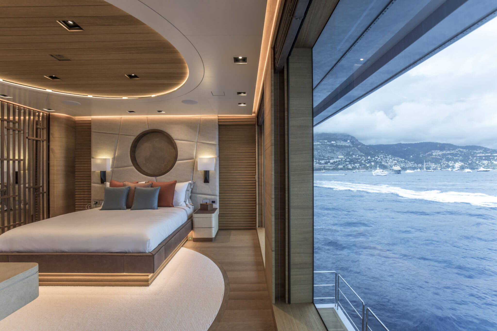 The warm natural colour scheme continues from the floor to the ceiling with plenty of oak used throughout, accompanied by darker walnut and wenge for contrast. Instead of relying on high gloss lacquers, the natural beauty of each material is brought out with a brushed finish that highlights the texture and grain. Lines are an important element in directing attention throughout the open plan interiors and take inspiration from Japanese design, and orchids and other hydroponic plants add a homely ambiance while keeping with the organic theme. Travertine, sunset onyx and emperador marble finish the high quality interiors in the en-suite bathrooms, and guests with a good eye will spot these materials finishing off the edges around the main salon wet bar and similar places.