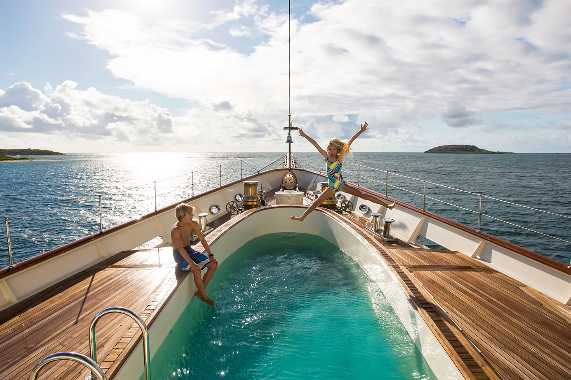 On the sun deck there’s a “flysail” shade to keep guests protected from the sun throughout the day. This shade can withstand wind speeds of up to 40 knots so you won’t get blown away. There’s a raised spa pool here too with lots of comfortable seating around it.