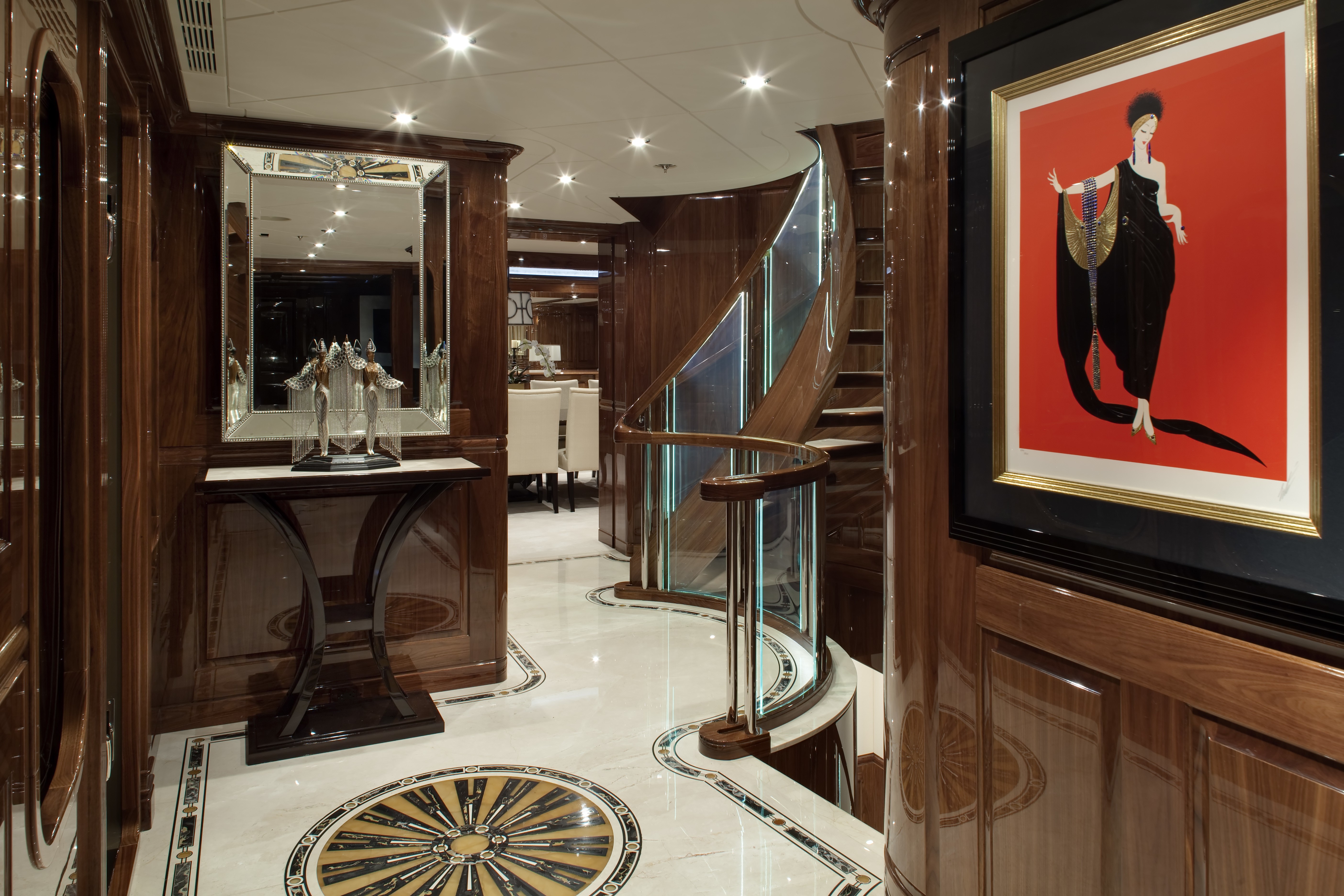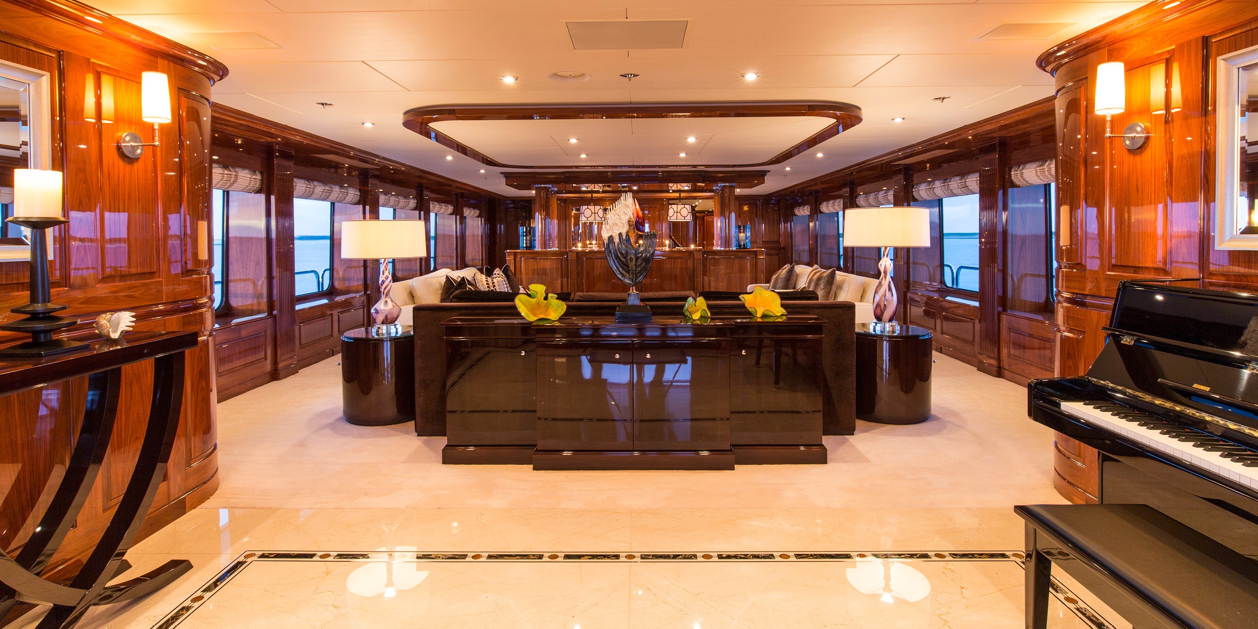 The interiors from Carol Williamson & Associates take inspiration from the art deco movement, as shown in the understated elegance of the furnishings and fittings, surrounded by the timeless combination of dark wooden panelling and off-white upholstery. As such, M/Y REMEMBER WHEN is ready for stately parties as well as holidays with family members of all ages.