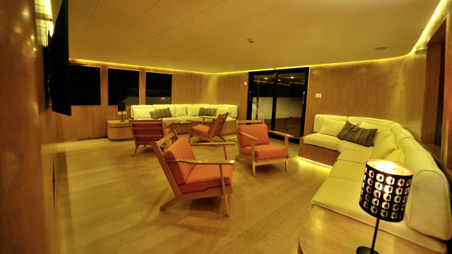 The beautiful minimalist interiors are designed for large groups, using light wooden panelling, decking and furniture for a fresh and contemporary appeal. The large windows let in plenty of natural light so that even with her wide beam all is illuminated. The largest gathering space on board is the main deck, and the dining area in particular offers plenty of table space for meals, board games and other hobbies.