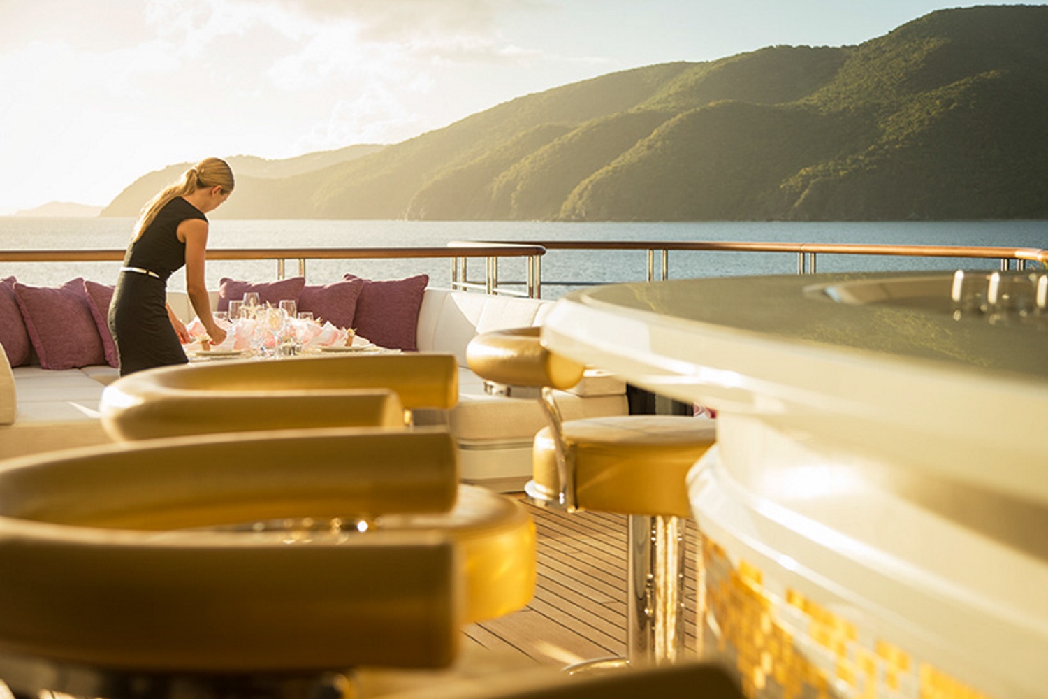 On the aft deck, leading out of the upper deck lounge are floor-to-ceiling glass doors. There’s an expansive living space out here that is for the use of guests. Whether you wish to dine here, have a drink or just chill out, there’s lots of furniture, great lighting and a lovely atmosphere. Glass panels protect sunbathers from the wind while triangular awnings on carbon fibre poles provide shade from the hot sun. Mosaic-clad infinity tubs are mounted above the deck level and the tub on the aft deck has a 6m jet flow! After spending a while in the infinity tub, relax on one of the sun beds, or have a refreshing drink from the bar, heavenly!
