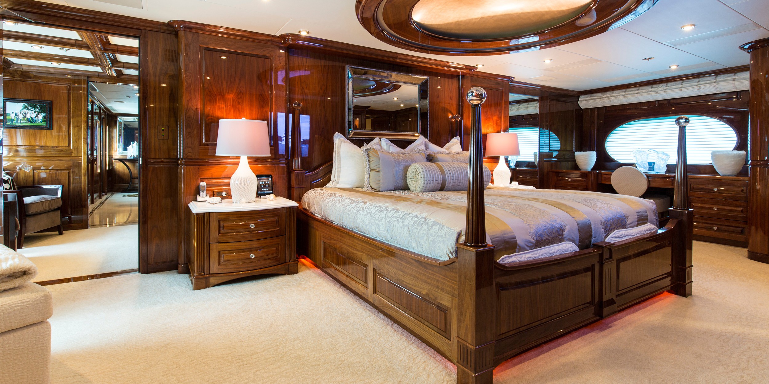 Fitness enthusiasts will find plenty of gym equipment up on the sundeck to maintain a fitness regime in the fresh air, and following a workout they can reward themselves with an alfresco lunch, a cocktail from the large wet bar or (arguably) best of all, a dip in the forward Jacuzzi pool to ease tense muscles, followed by a nap on the surrounding sunbeds. Guests don't even need to leave the pool for refreshments: The aft side has a bar ledge with stool seating to let guests who want to stay dry carry on the conversation.
