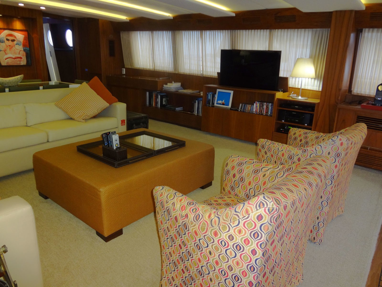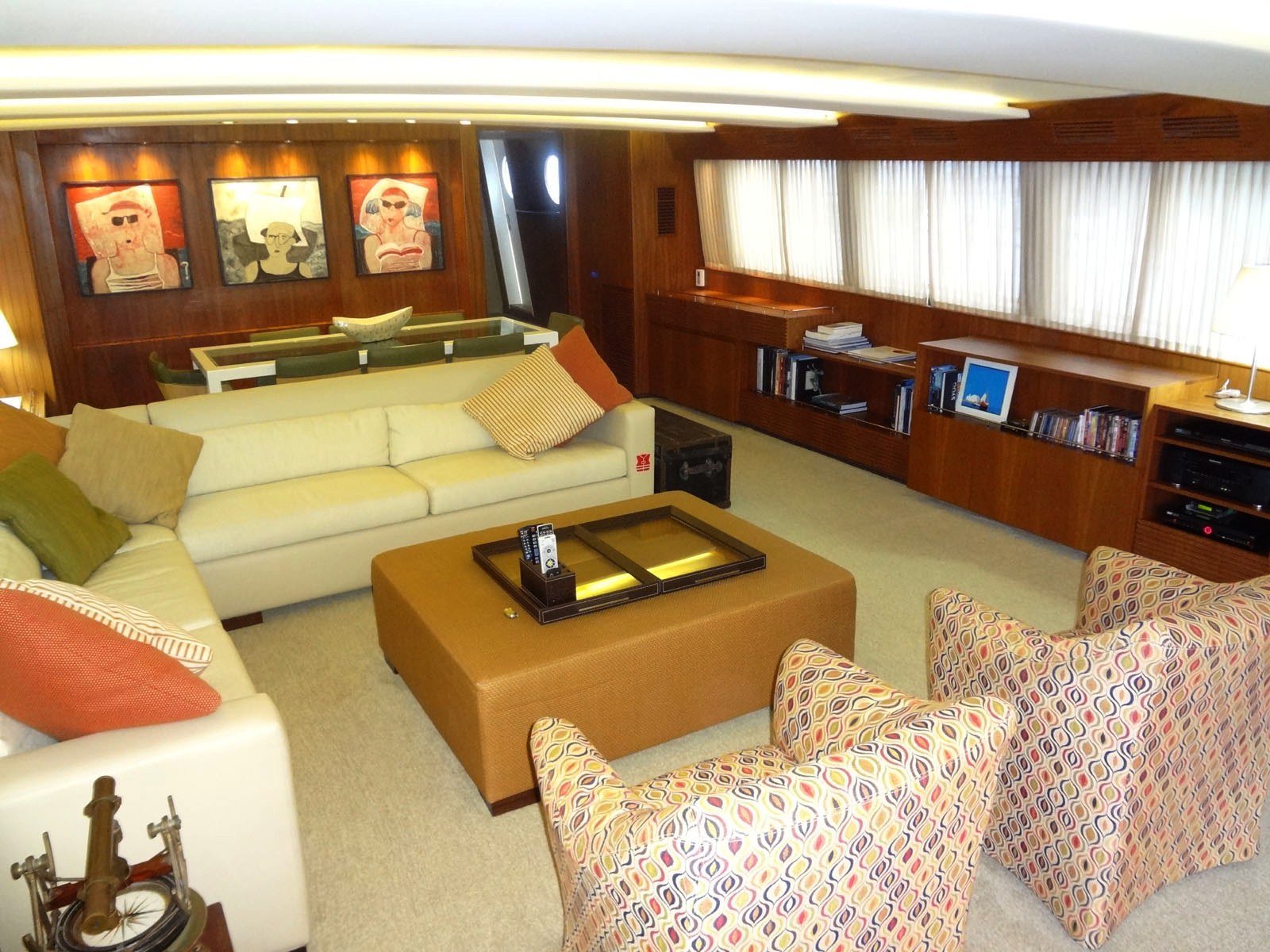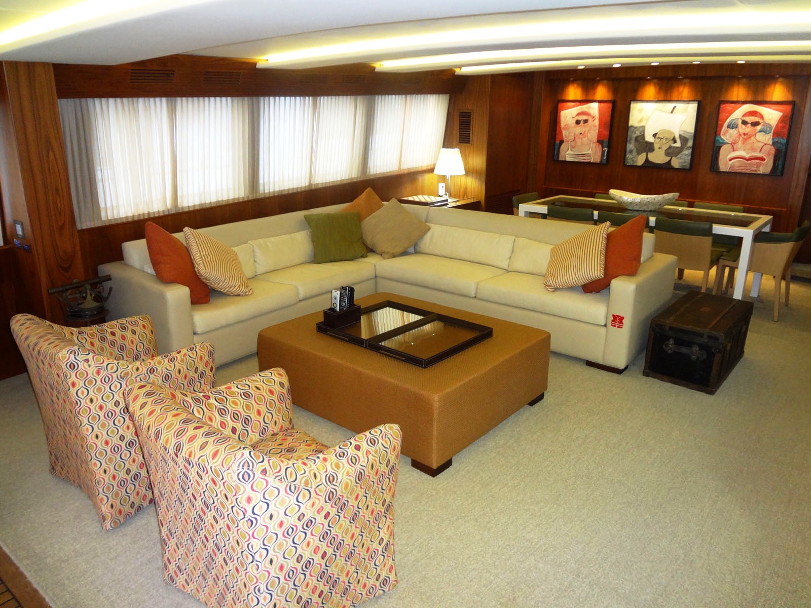 M/Y VINTAGE is able to accommodate up to 8 guests in 4 spacious cabins including a Master cabin, a VIP Cabin and two twin cabins. She has a funky interior with a large L shaped couch along with two occasional chairs and a coffee table plus entertainment system in the salon. Further forward, the adjoining dining area can set up to 8 guests. Unique artwork and fabrics makes the interior of the VINTAGE motor yacht fun while still being welcoming and comfortable.