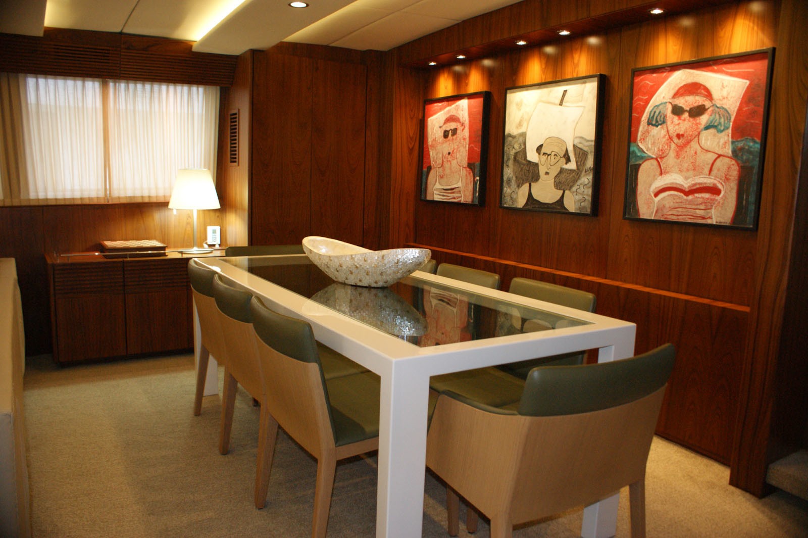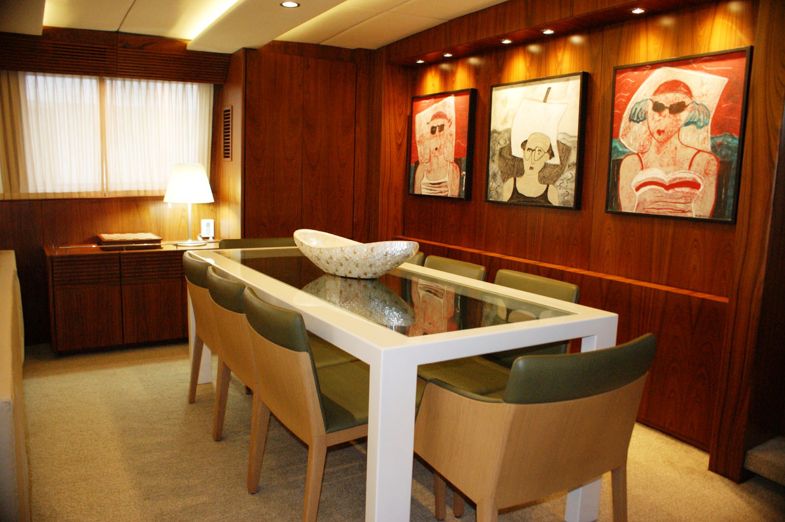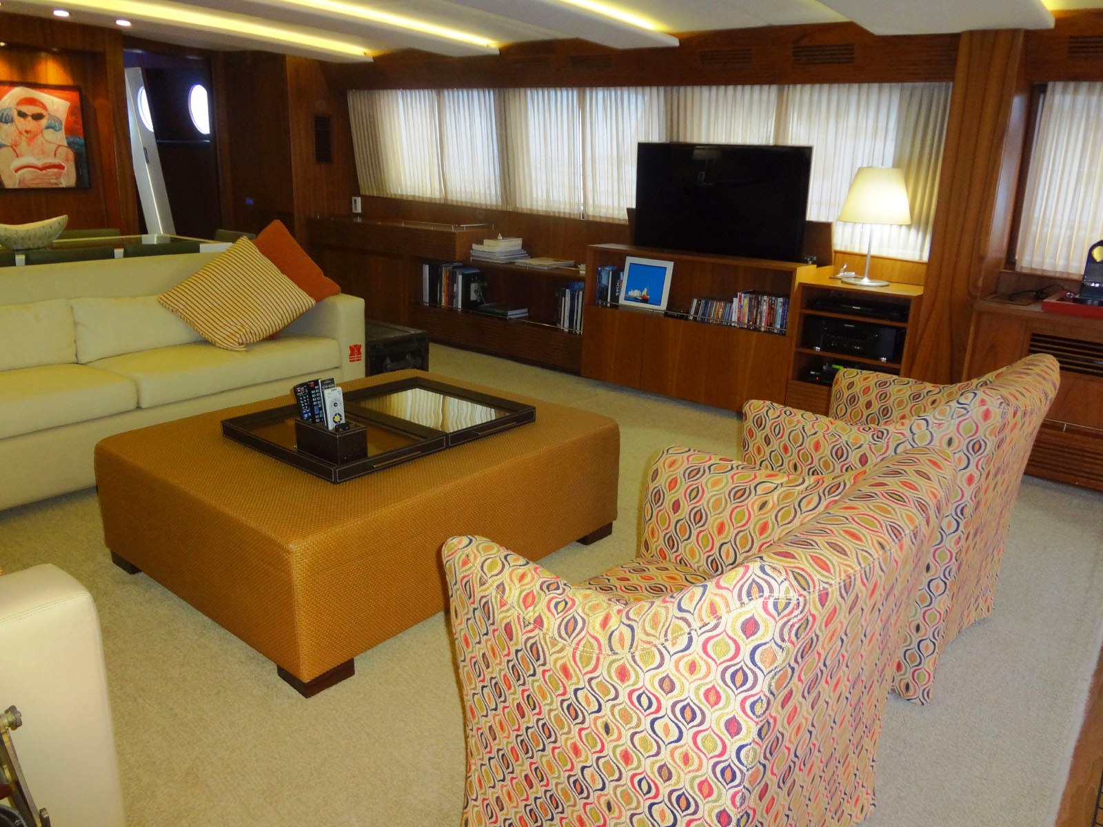 M/Y VINTAGE is able to accommodate up to 8 guests in 4 spacious cabins including a Master cabin, a VIP Cabin and two twin cabins. She has a funky interior with a large L shaped couch along with two occasional chairs and a coffee table plus entertainment system in the salon. Further forward, the adjoining dining area can set up to 8 guests. Unique artwork and fabrics makes the interior of the VINTAGE motor yacht fun while still being welcoming and comfortable.