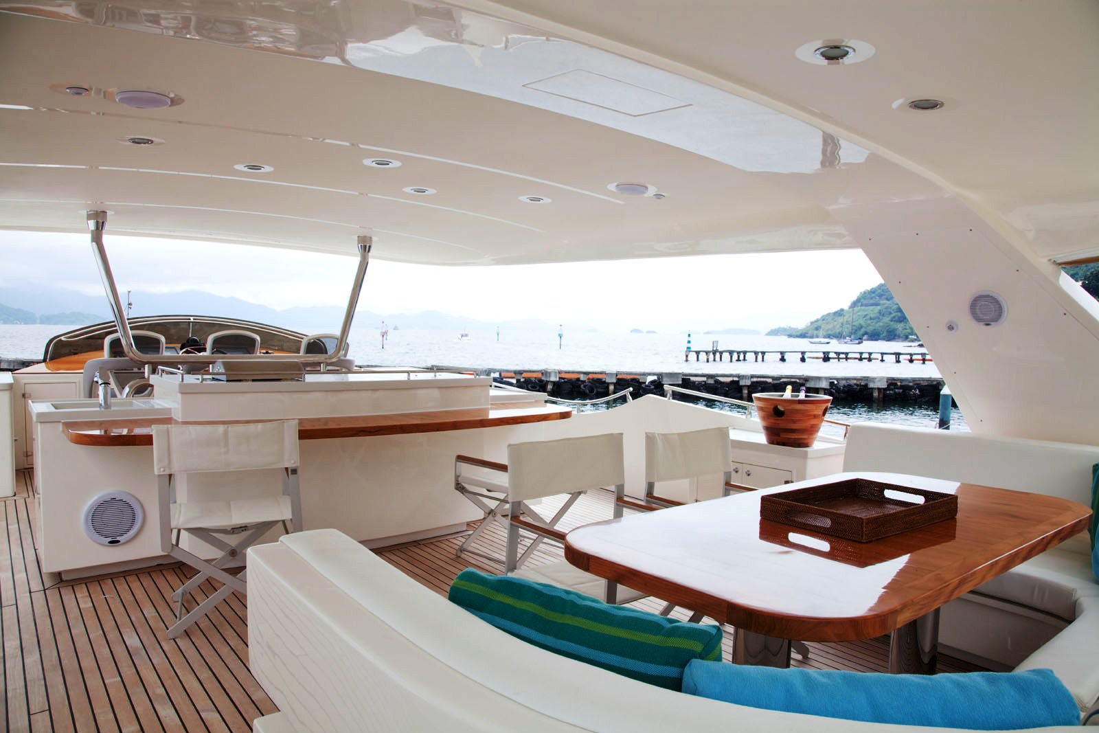 Her outdoor areas are spacious and are a favourite area of her owners for al fresco dining and relaxing. The upper deck boasts a wetbar and BBQ along with al fresco dining table. The aft deck has a further al fresco dining table. Large stairs on either side of the hull lead down from the aft deck to the swim platform where guests can enjoy water sport activities.
