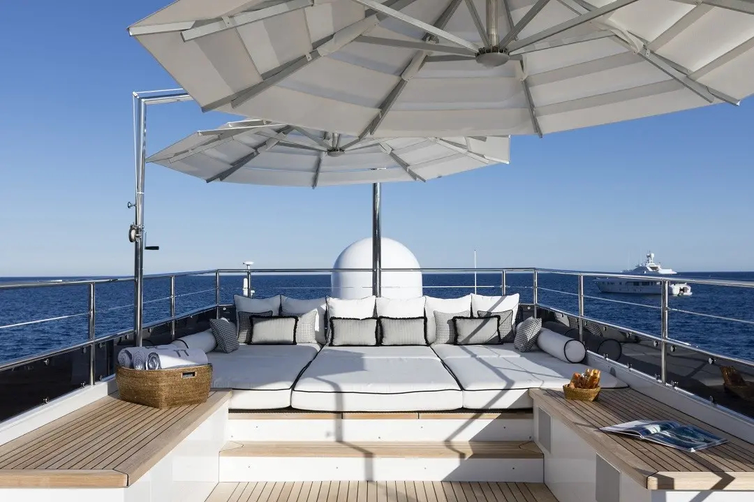 One of the highlights is her vast sun deck with a huge sun pad and a bar with stools, and plenty of deck area to entertain or simply relax under the sunshine.