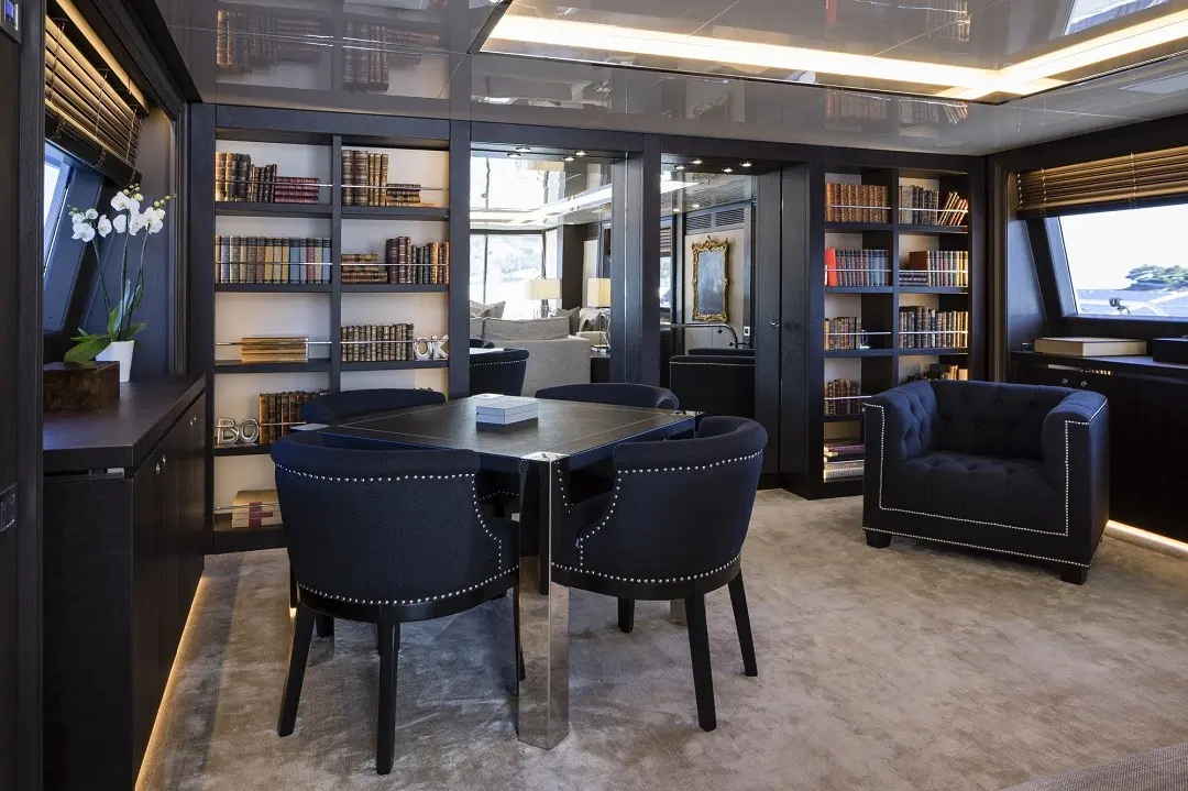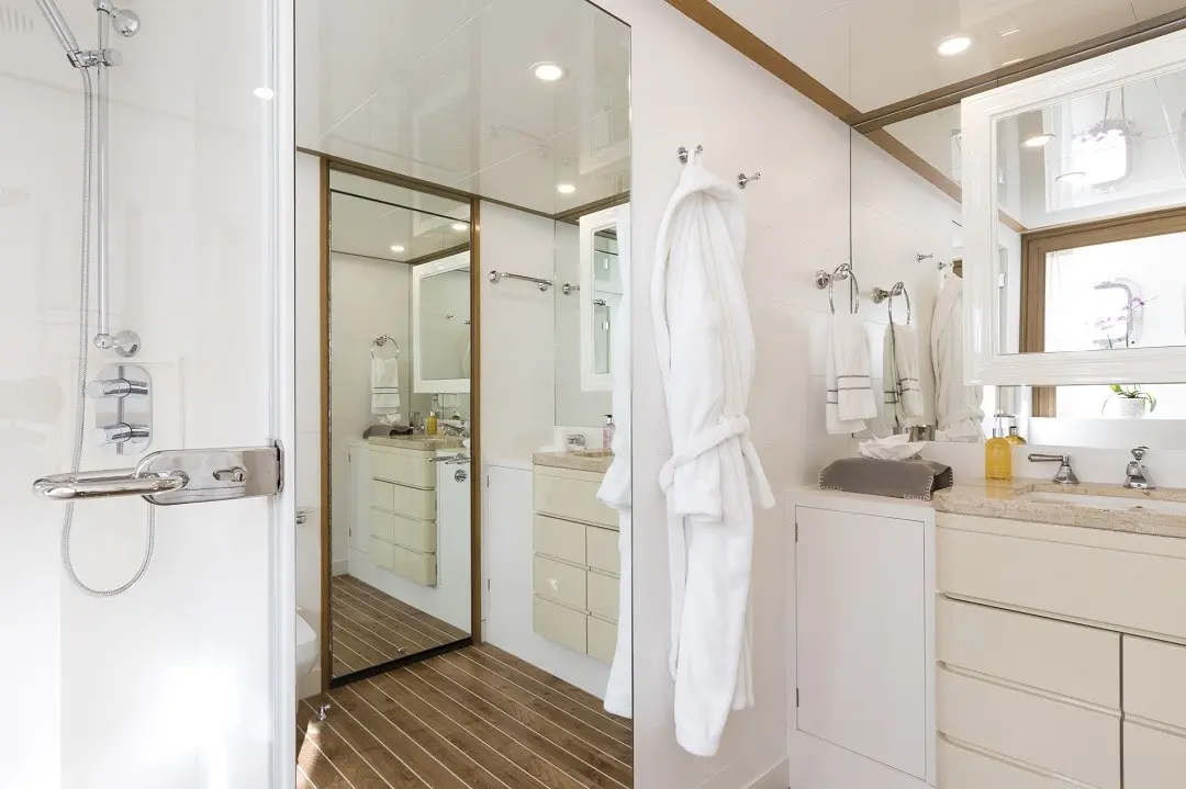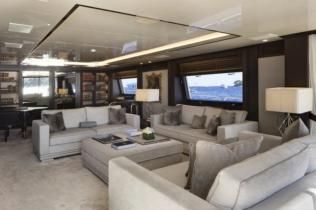 Her interiors are characterised by modern, fresh looking decor with a beach-house style environment. Her main saloon is spacious with comfortable sofas, beautiful classic-modern furnishings, offering a welcoming feel and a pleasant environment.