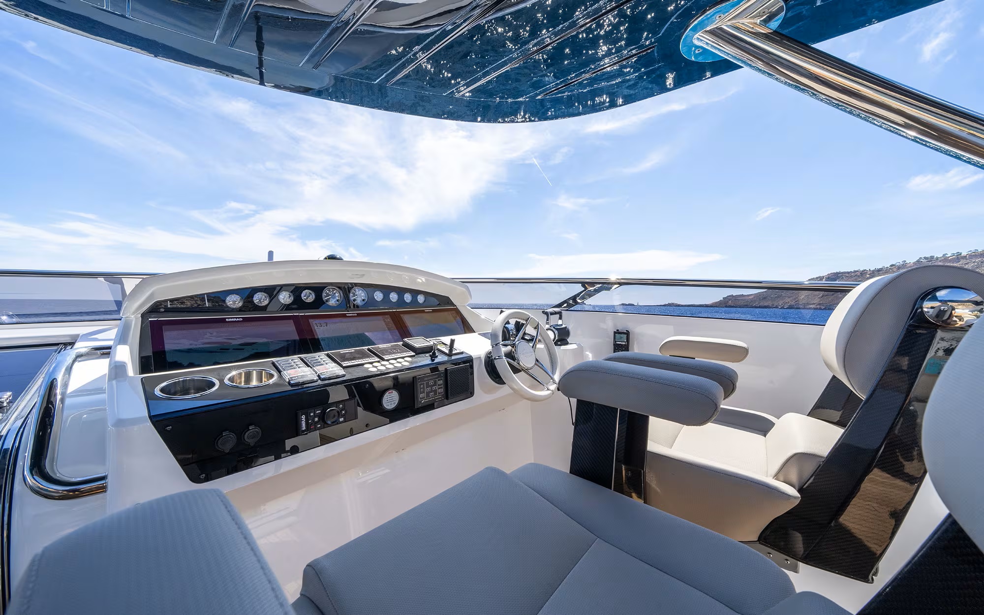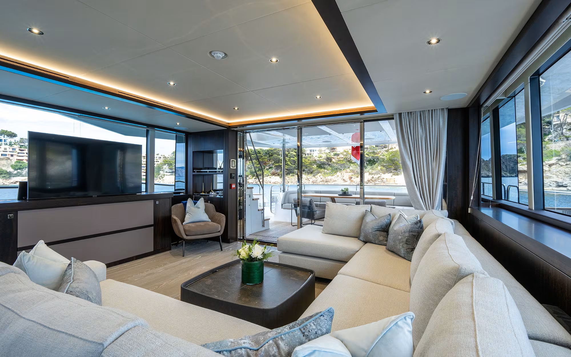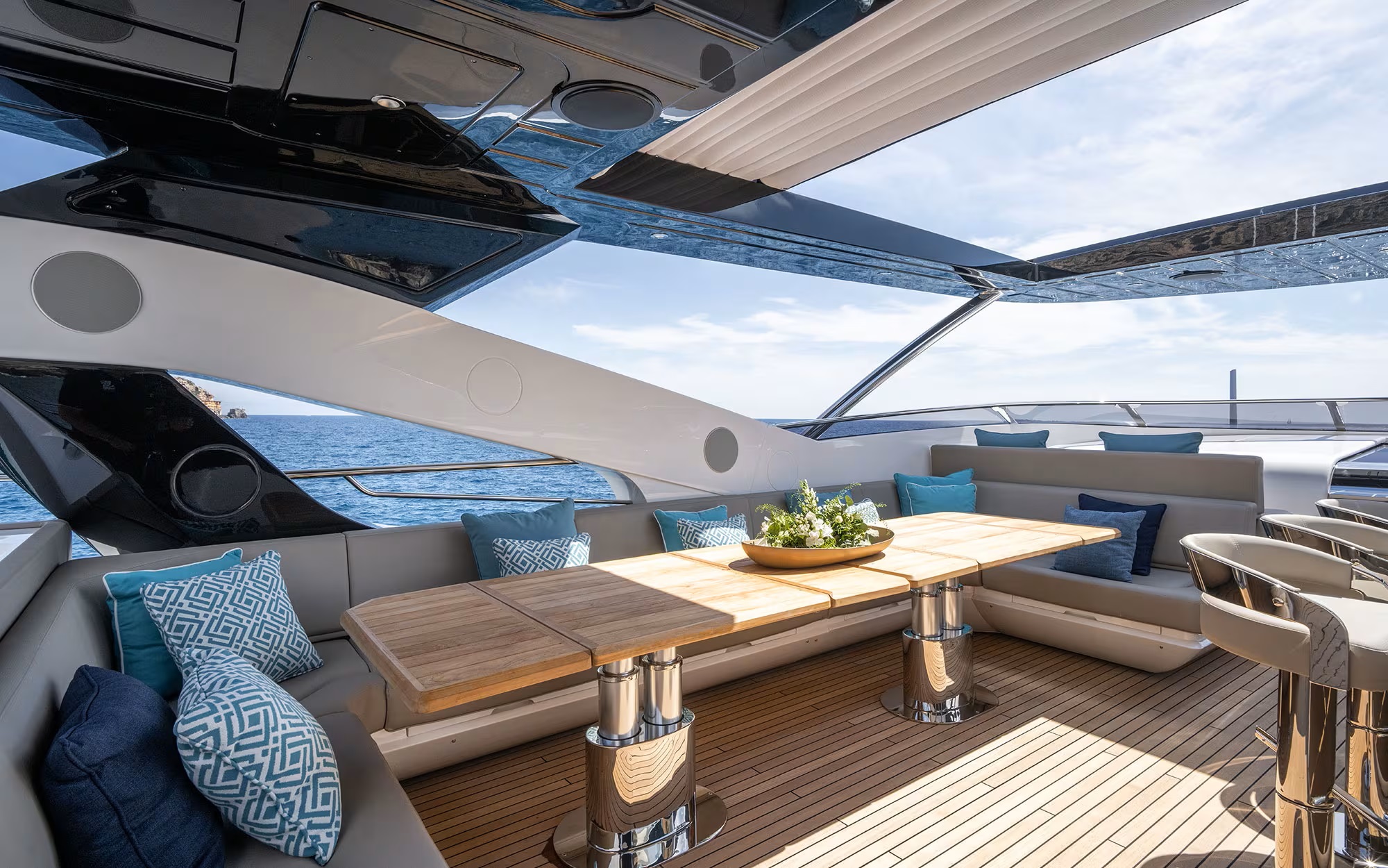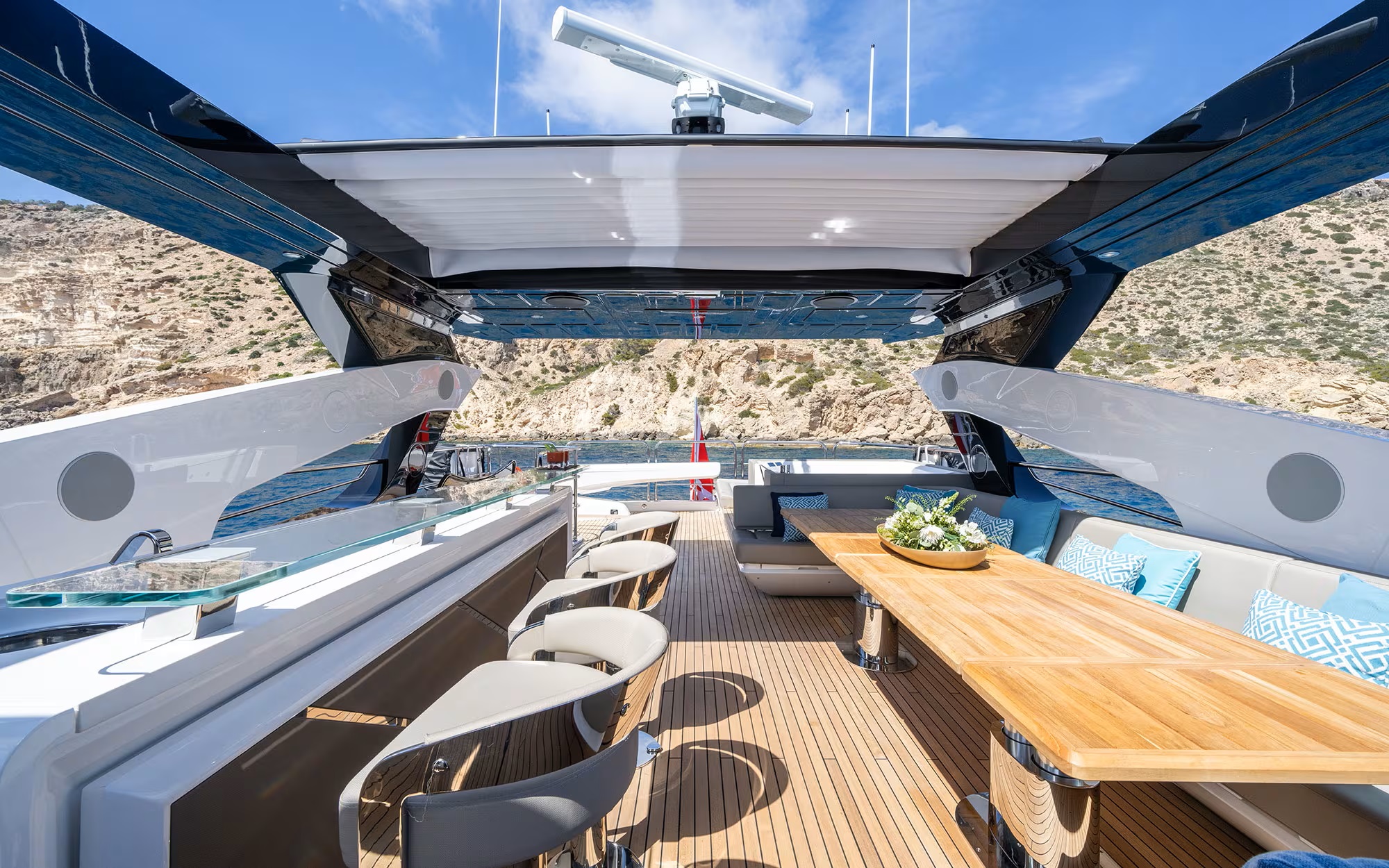 The striking profile is characterised by the angular superstructure which is punctuated by oblique glazing. The flybridge layout creates plenty of al fresco entertainment and relaxation space across the sun deck, main deck aft and foredeck.