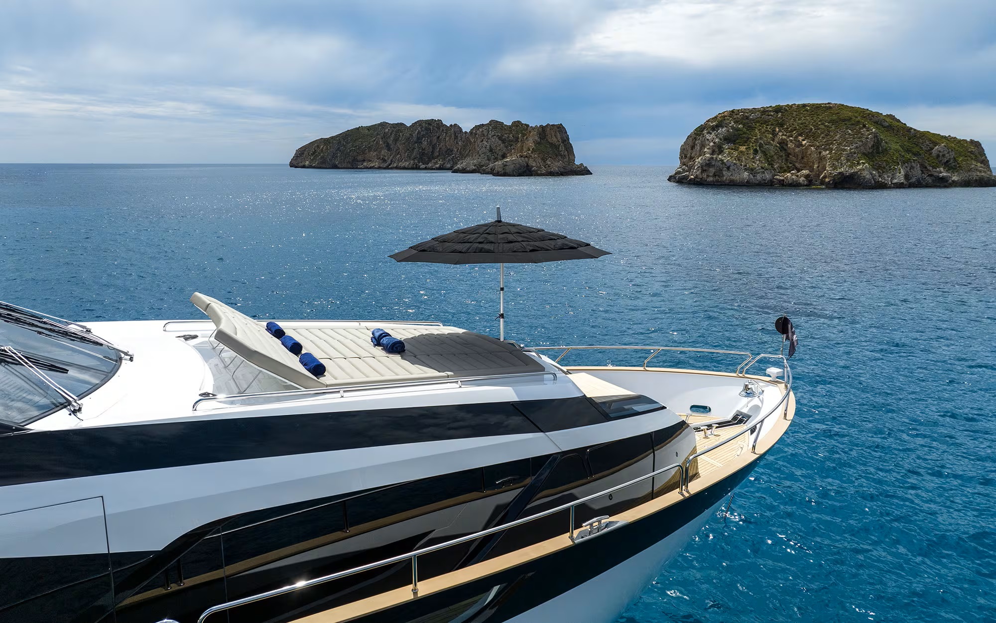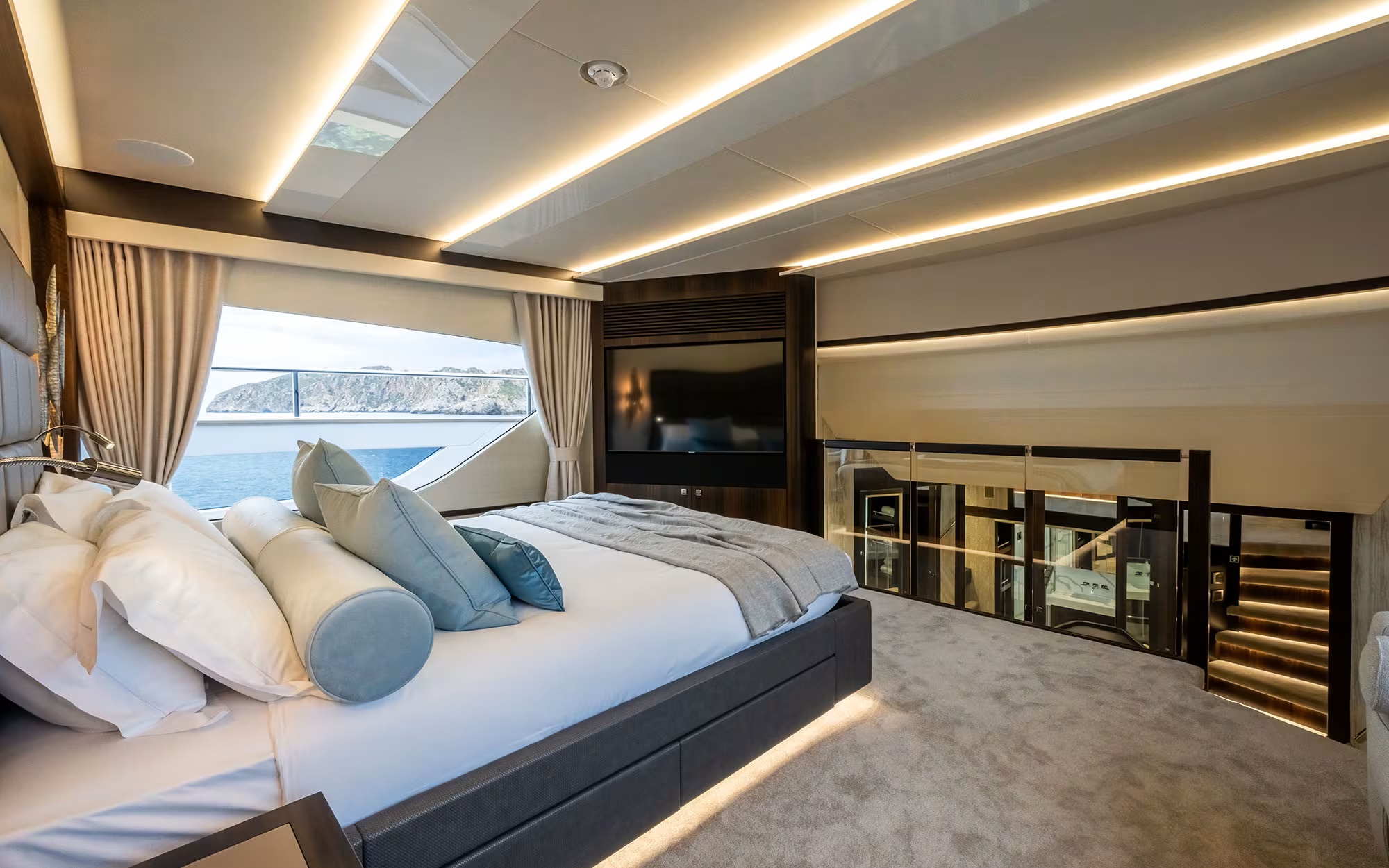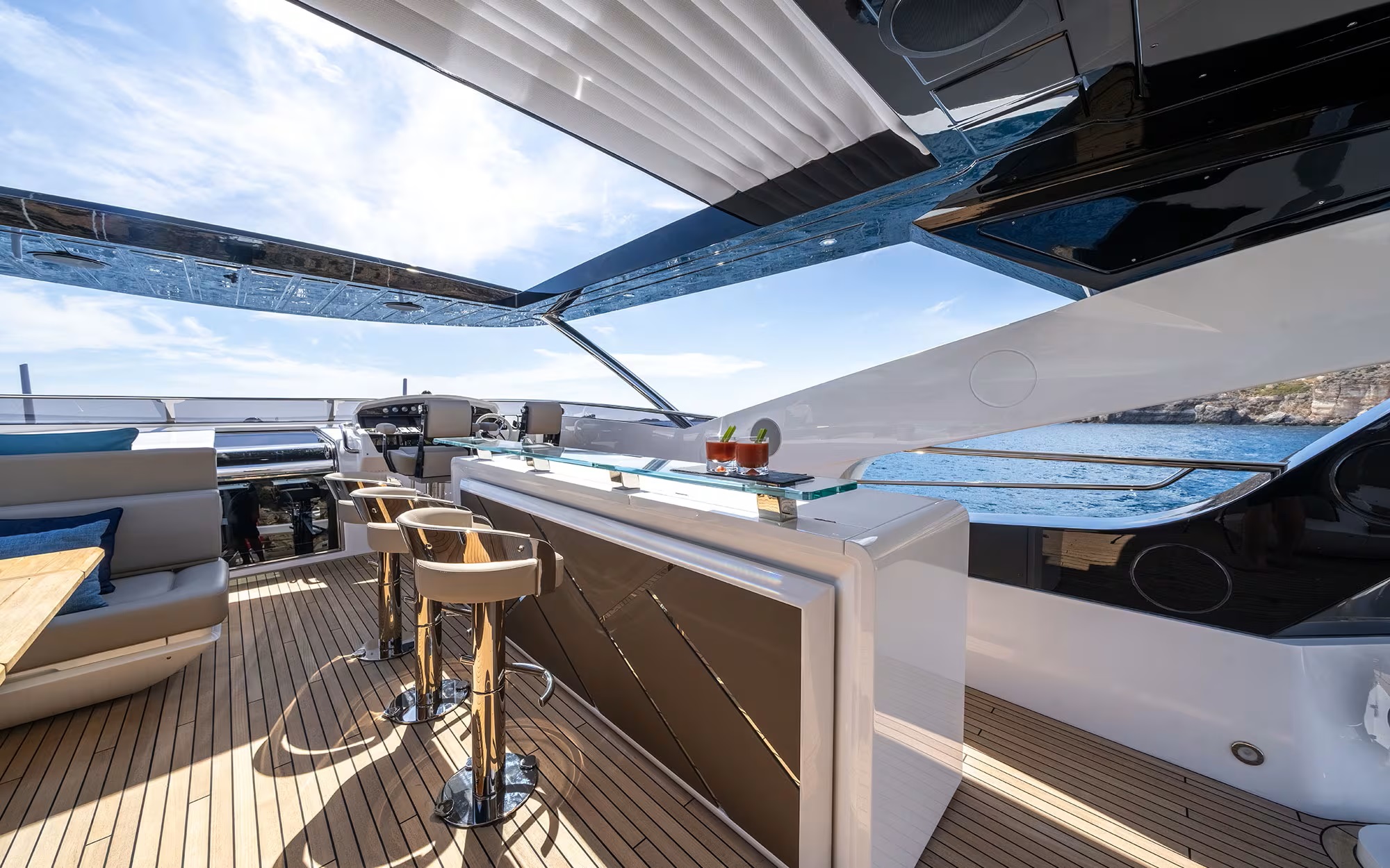 The striking profile is characterised by the angular superstructure which is punctuated by oblique glazing. The flybridge layout creates plenty of al fresco entertainment and relaxation space across the sun deck, main deck aft and foredeck.