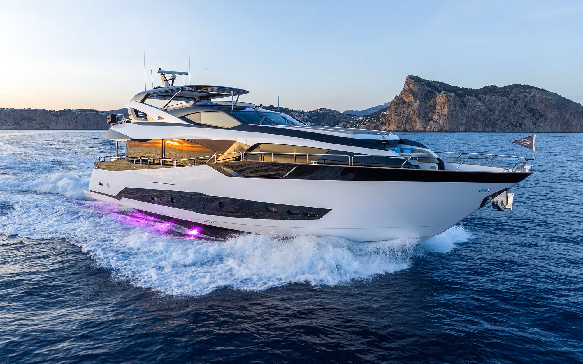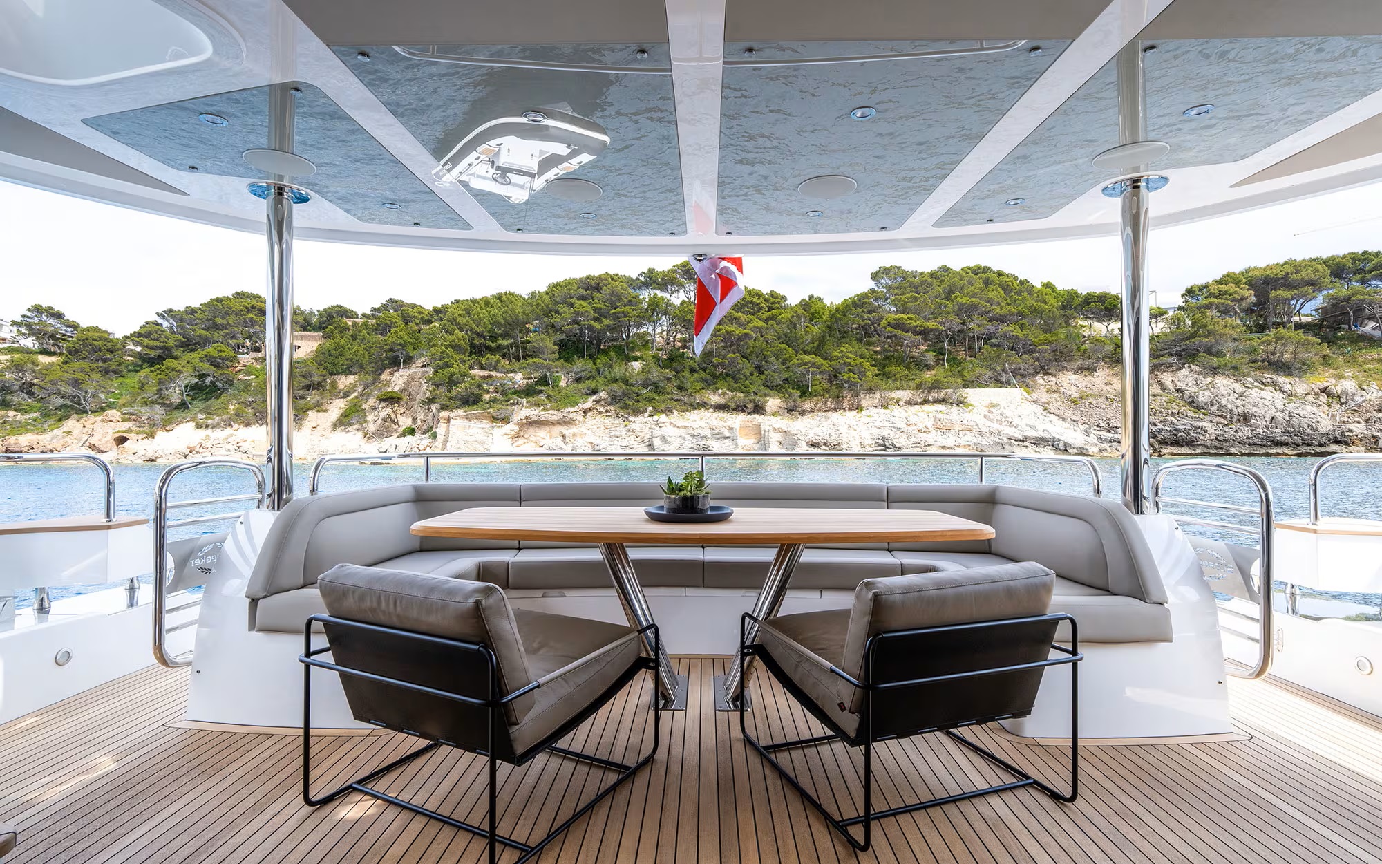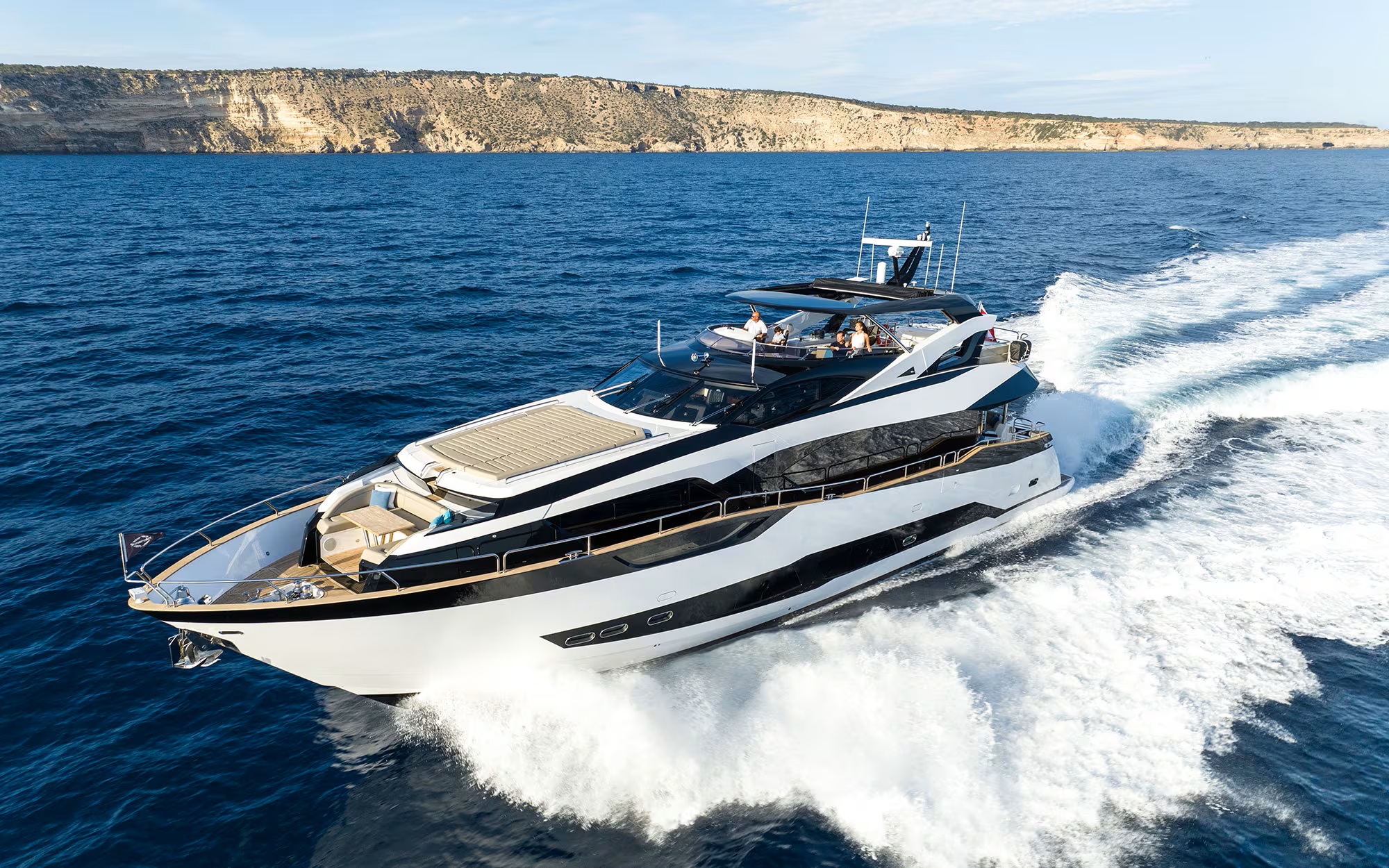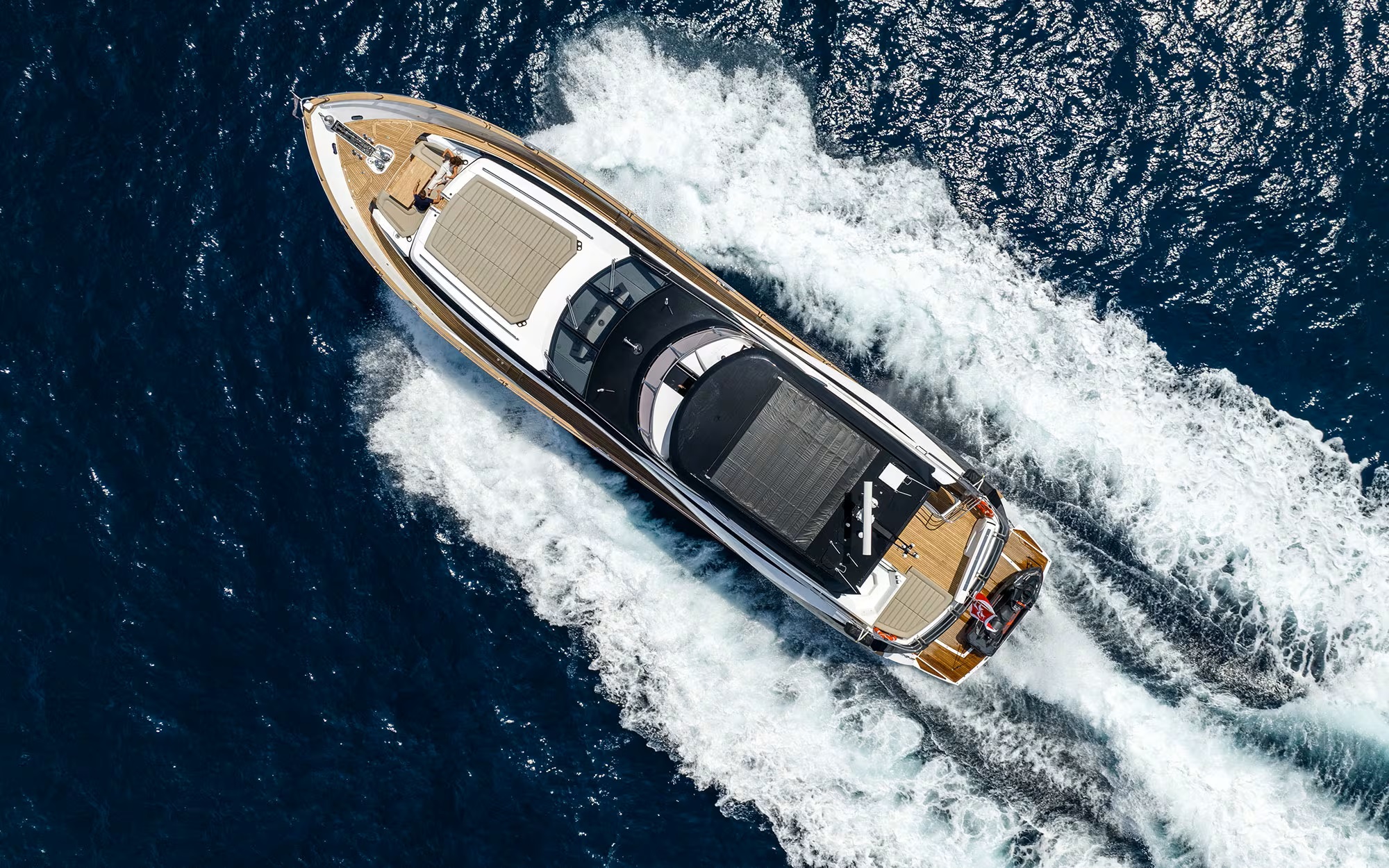 The striking profile is characterised by the angular superstructure which is punctuated by oblique glazing. The flybridge layout creates plenty of al fresco entertainment and relaxation space across the sun deck, main deck aft and foredeck.