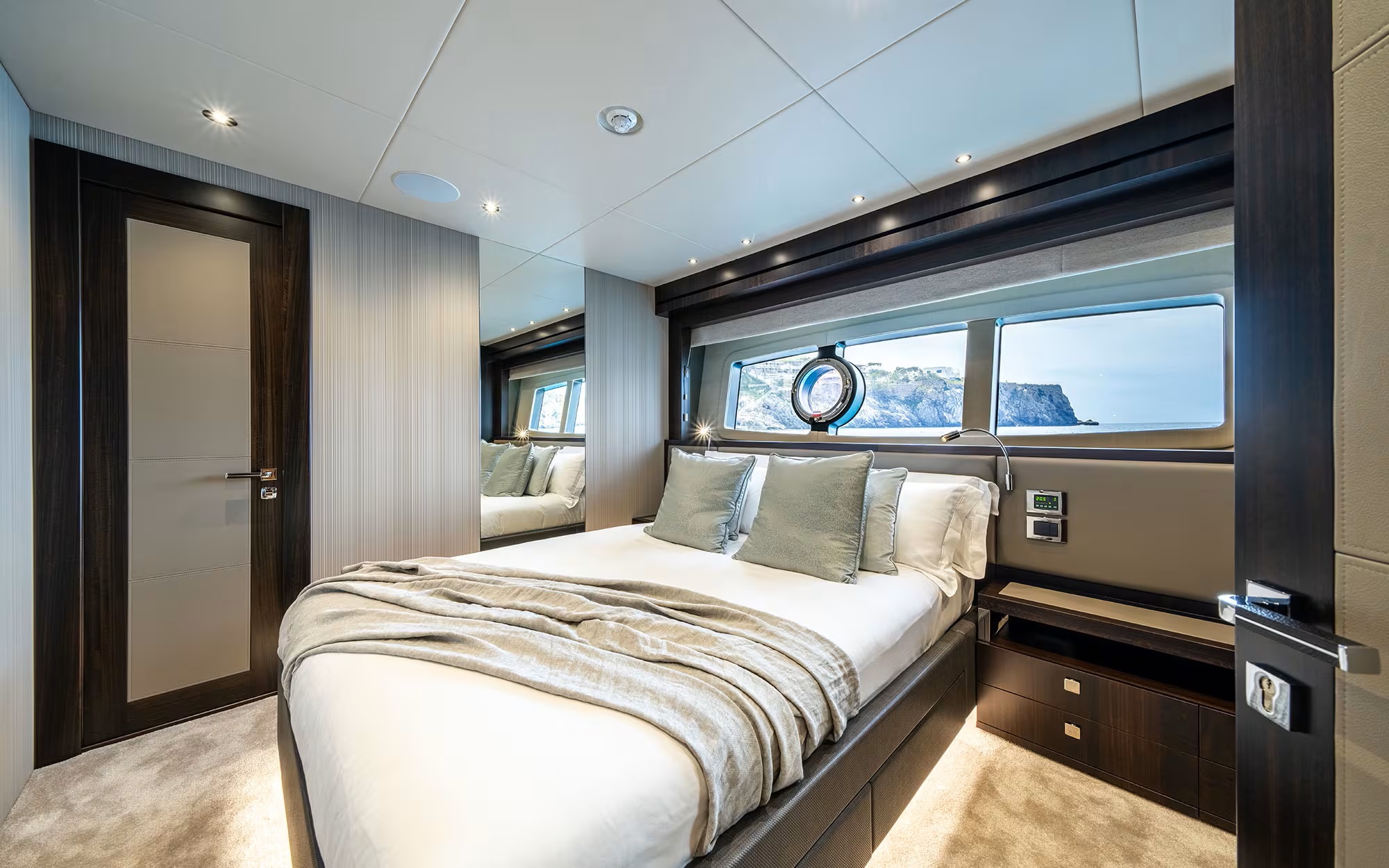 The contemporary interior is filled with light thanks to the panoramic glazing and is furnished to create convivial guest spaces and luxury, private suites. The main salon is configured with a lounge aft and dining room forward with access through sliding glass doors to the aft cockpit and fold out balcony to starboard. Modern furniture, a neutral colour-scheme and comfortable upholstery create a warm and welcoming space from where guests can still make the most of the surroundings.