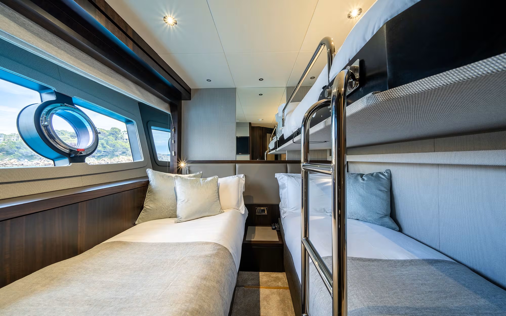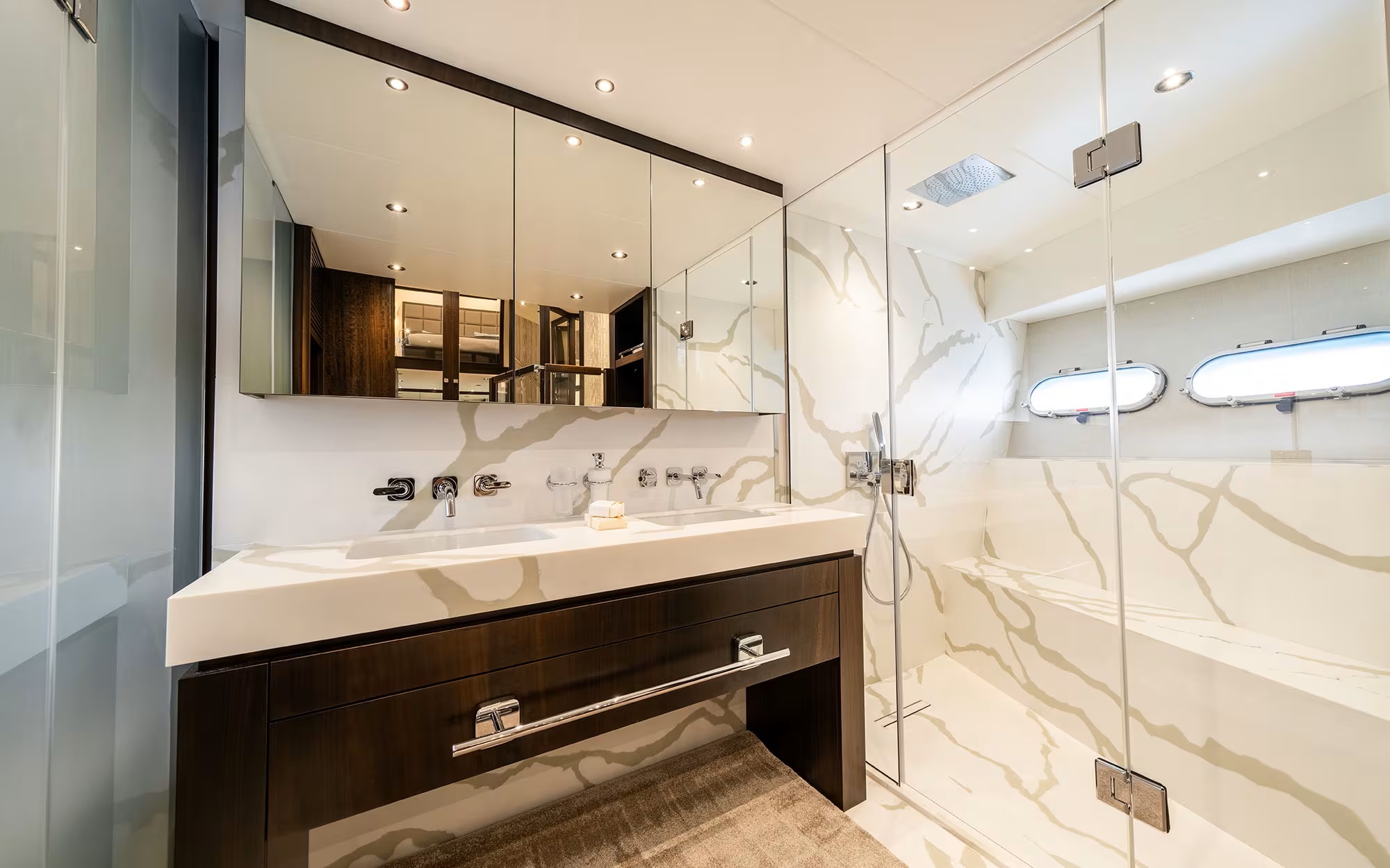 A truly special split-level master stateroom features the berth on the main deck and a forward staircase leading to a mid-level dressing area and sumptuous en-suite. A further four suites on the lower deck are configured as two doubles and two twins (each with additional pullman bunks) each with deluxe ensuite bathroom facilities.