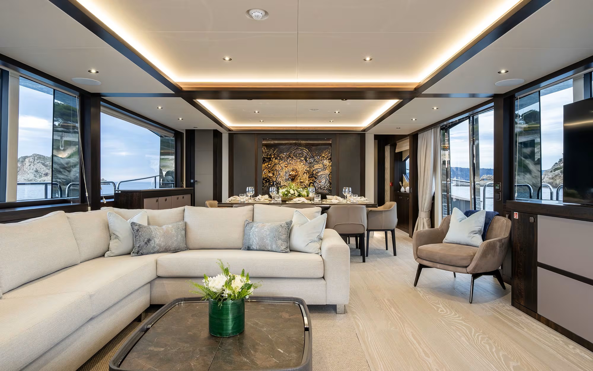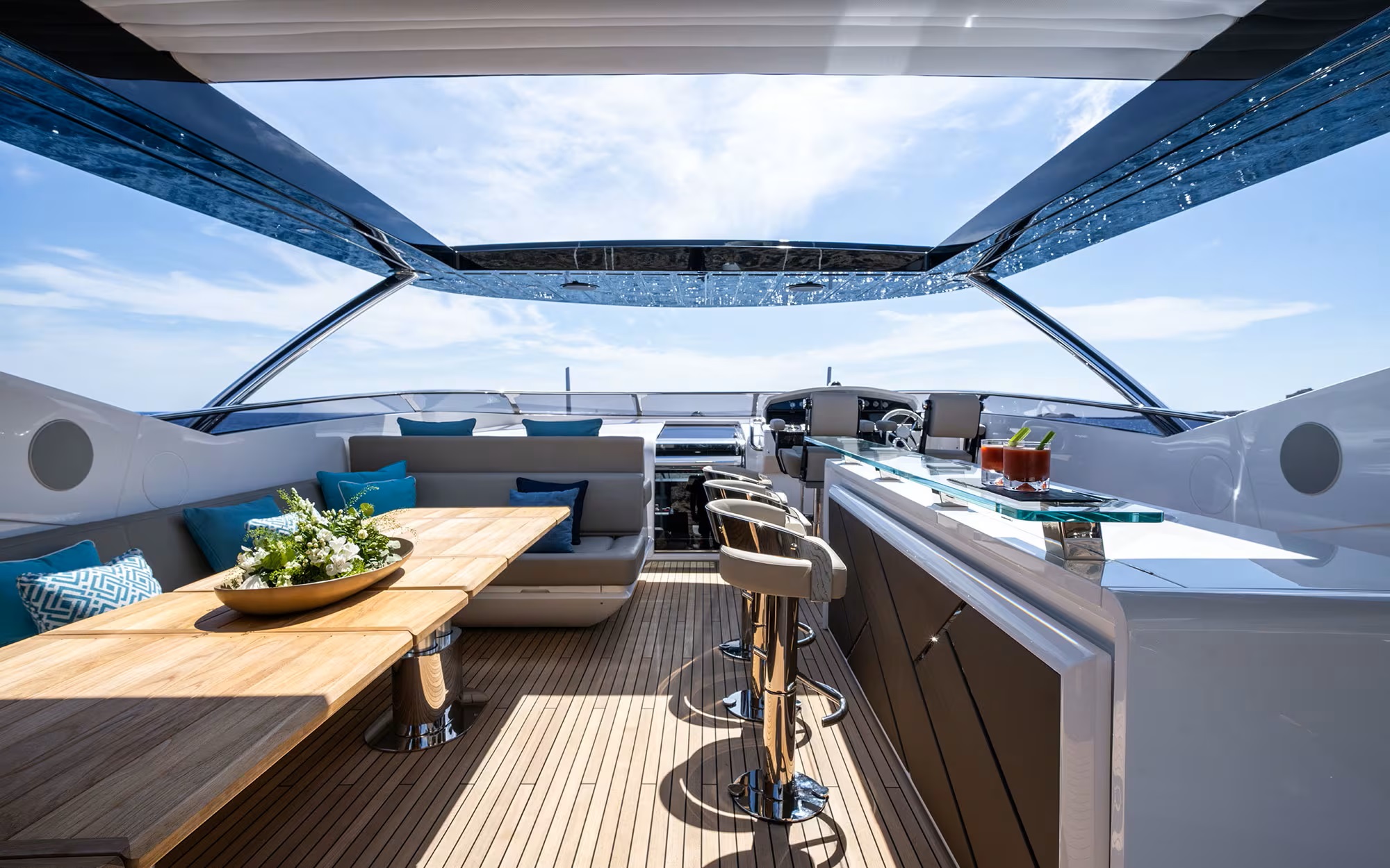 The sun deck is a sociable hub boasting a u-shaped dining setting with a bench sofa and adjustable table, sit up bar and delightful glass-sided jacuzzi with adjacent sun pad. The helm controls are forward to starboard, additional companion seating is to port and central steps lead into the main wheelhouse. There is a hard framed roof over the deck with a retractable section allowing the area to be open to shaded depending on guests’ preference.