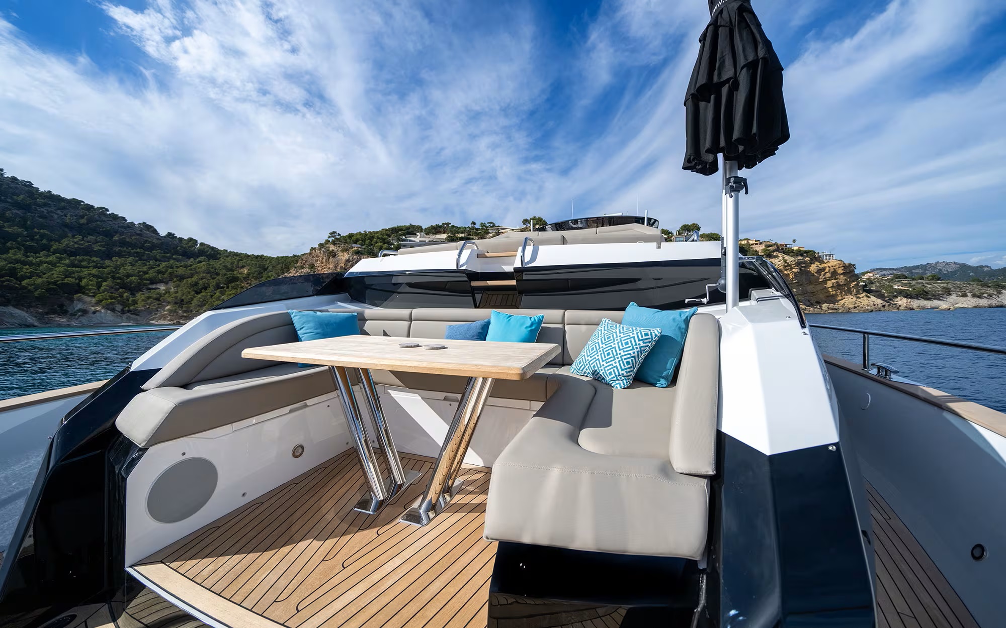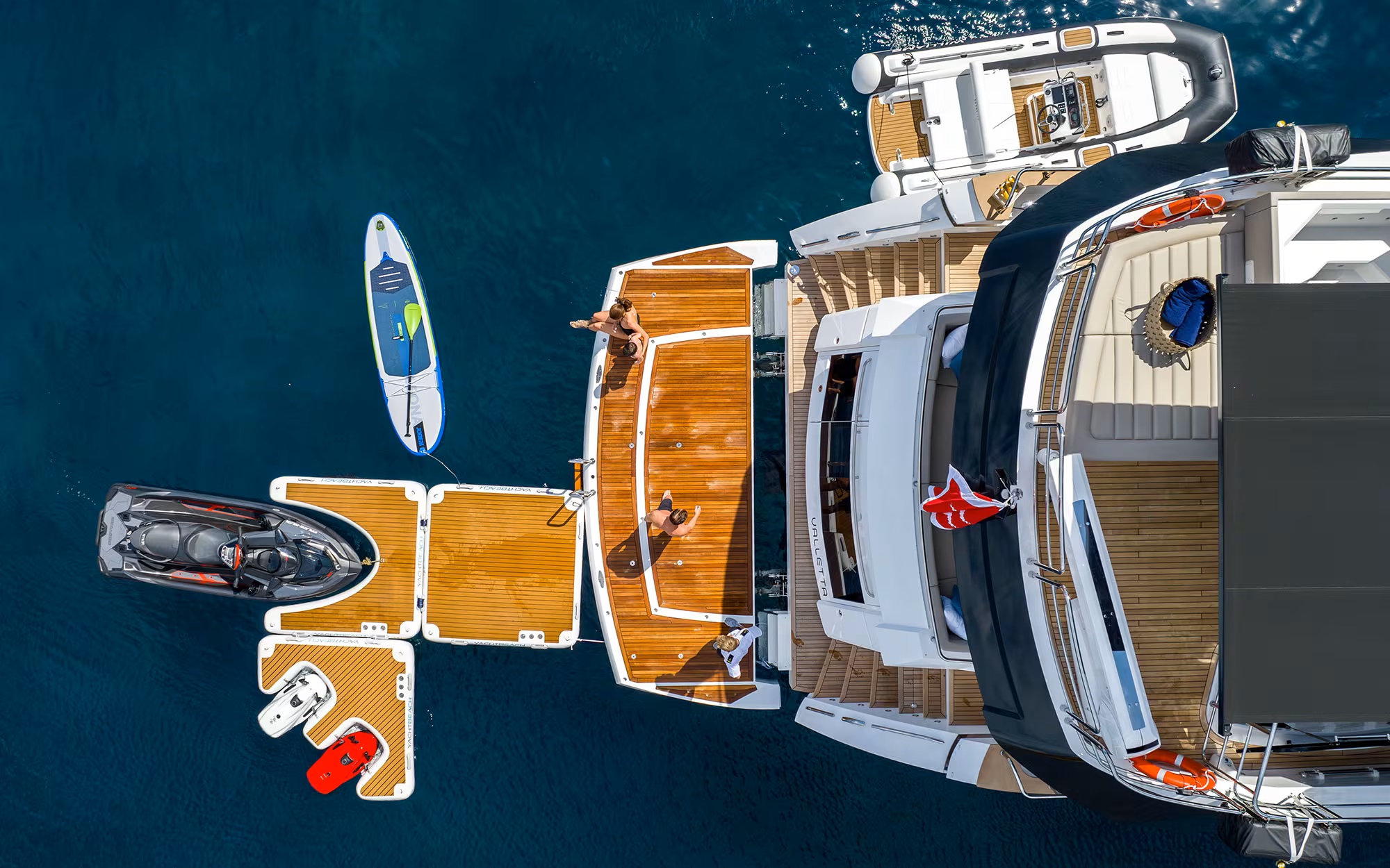 The foredeck has a sensational double sun pad with adjustable head rests on the upper level and a cosy seating/dining area on the lower level. The aft cockpit creates another al fresco dining setting with u-shaped sofa and other moveable chairs. Steps lead down to the water’s edge swim platform which can be further extended by an inflatable dock.