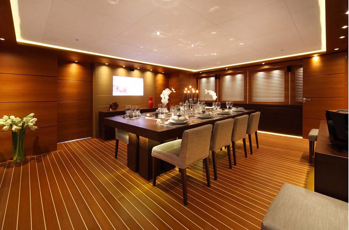 On the upper deck which also has access to the exterior deck, there’s a full beam master cabin. Alongside is a Jacuzzi, a steam bath and spa room. The main deck also features a VIP cabin with en suite facilities, a private Jacuzzi and steam bath. The dining area takes up to 20 guests, perfect for a celebratory dinner or special occasion. Two double cabins are located on the lower deck as well as two twin cabins.