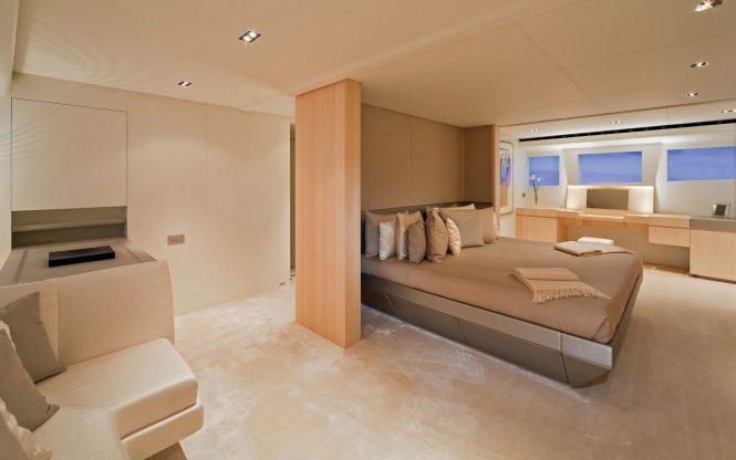 Accommodation is over 5 cabins, for a maximum of 10 charter guests, comprising a main deck master stateroom, with a full beam layout forward of the yacht. Below decks are 2 double and 2 twin cabins.