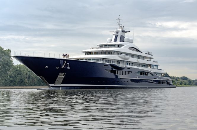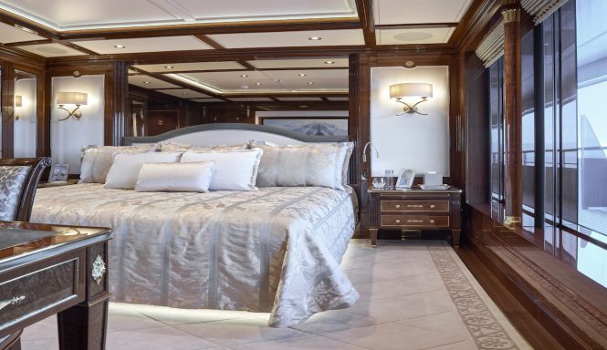 British studio Winch Design has produced a few of the interiors on this list, and their latest is arguably their most impressive yet: 111.5m/365.10ft Lürssen mega yacht TIS has period French interiors spanning the reigns of Louis XIV to Louis XVIII. Calacatta Vogli marble and gold leaf is used throughout, the most stunning example being the spa with bas relief lemon grove with golden lemons on the ceiling. Fireplaces and bookcases are perfectly integrated into the finely panelled walls and you might even forget that you are on board a yacht as you relax and entertain in the palatial setting. The accommodation sleeps 18 guests across nine en-suite cabins, who will wake every day to comprehensive spa and entertainment facilities and an exhaustive list of water toys ready for fun on the water.