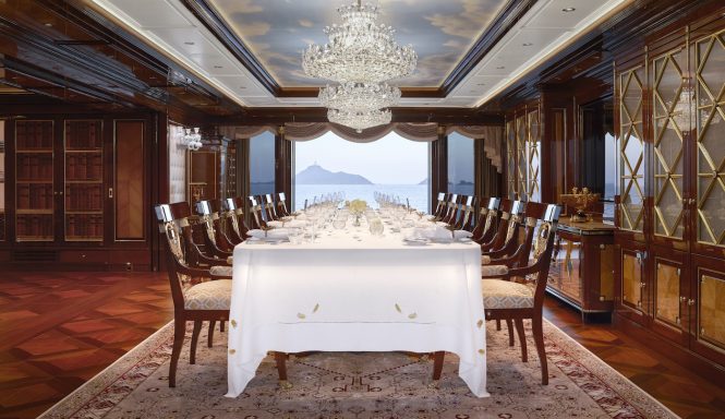 At first glance you’ll feel as though you’re stepping back in time when you board Lürssen superyacht AMADEA, but integrated into her luscious 18th Century interiors from Zuretti Interior Design is the very latest in modern entertainment and comfort. A wine cellar and humidor are placed beside the beach club and conference room for convenience, the main salon has a hand-painted Pleyel grand piano, and another piano can be found in the Owner’s private lounge. The top deck formal dining area is the highlight of the already impressive surroundings and places planters beside the full-height windows and waterfall features as chandeliers hang from the beams of the transparent ceiling for an unforgettable dining experience, in the sunshine or under the stars.