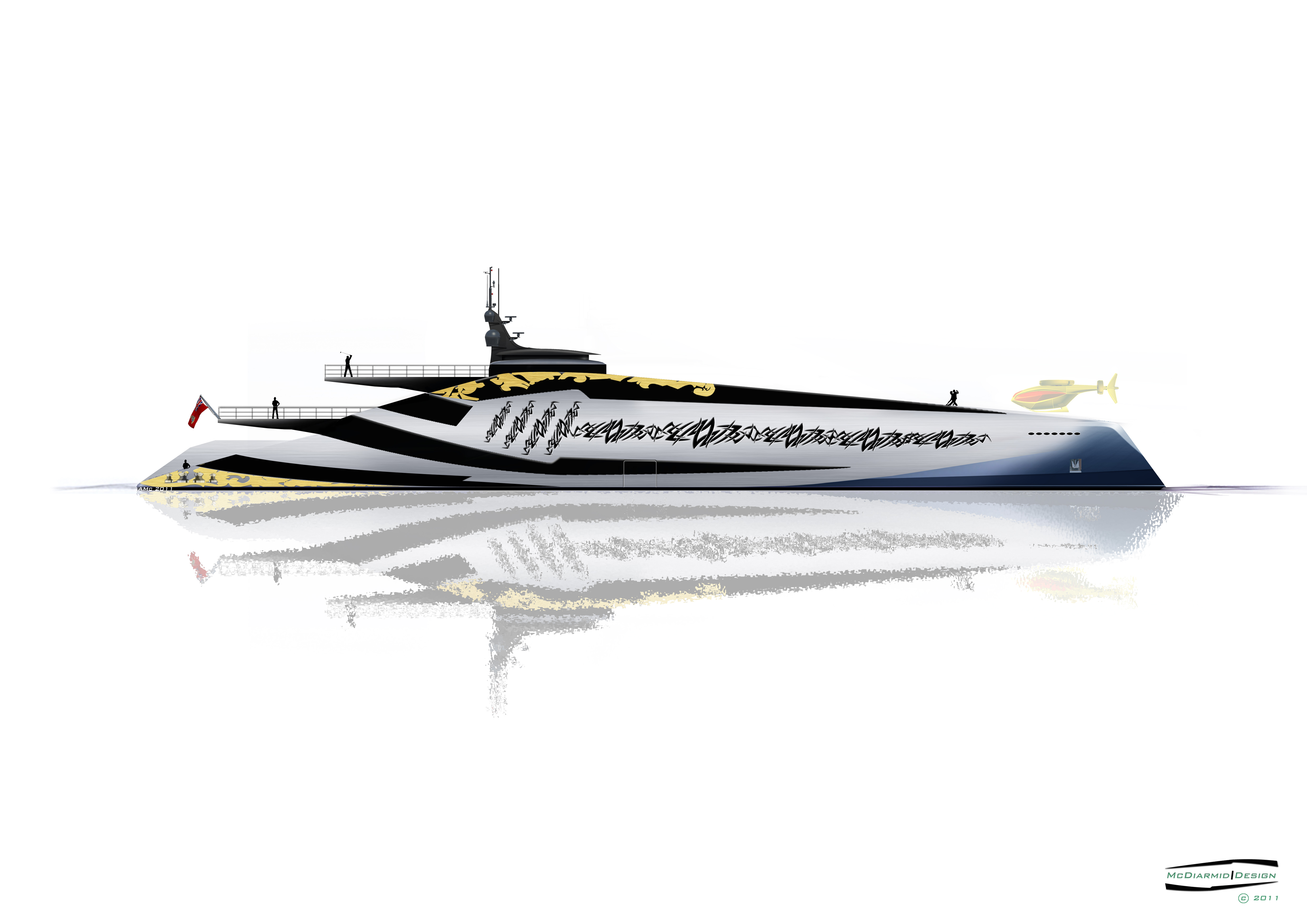 McDiarmid Design – 100m side profile Superyacht Duel – reverse bow A2