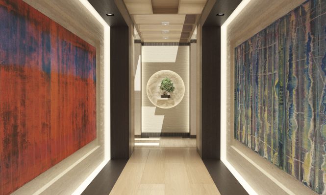 Designed on Oceanco’s LIFE platform, the yacht will have lower GT and hence less power, which will allow to reduce technical areas onboard and expand room for relaxation and socialising. The single tire room located in the LIFE platform will ensure spacious accommodation, entertainment space and flexible layout.